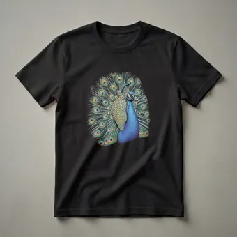Nature lovers and wildlife enthusiasts will appreciate the intricate detail of this vintage-style peacock drawing. The artwork features a male peacock, known for its iridescent blue and green plumage, in the midst of displaying its magnificent train of tail feathers. Each feather is adorned with the characteristic 'eye' pattern, rendered with delicate lines and subtle shading that gives the drawing a classic, artistic feel. Peacocks, native to South Asia, are renowned for this elaborate courtship display, a behavior that has captivated humans for centuries. This t-shirt is a thoughtful gift for anyone who admires the beauty and complexity of the natural world, particularly bird watchers and those who enjoy unique, artistic apparel. Wear this striking tee to nature walks, bird watching excursions, or simply as a conversation starter that highlights your appreciation for these majestic birds. It's a staple in the collection for anyone drawn to the elegance of avian life.