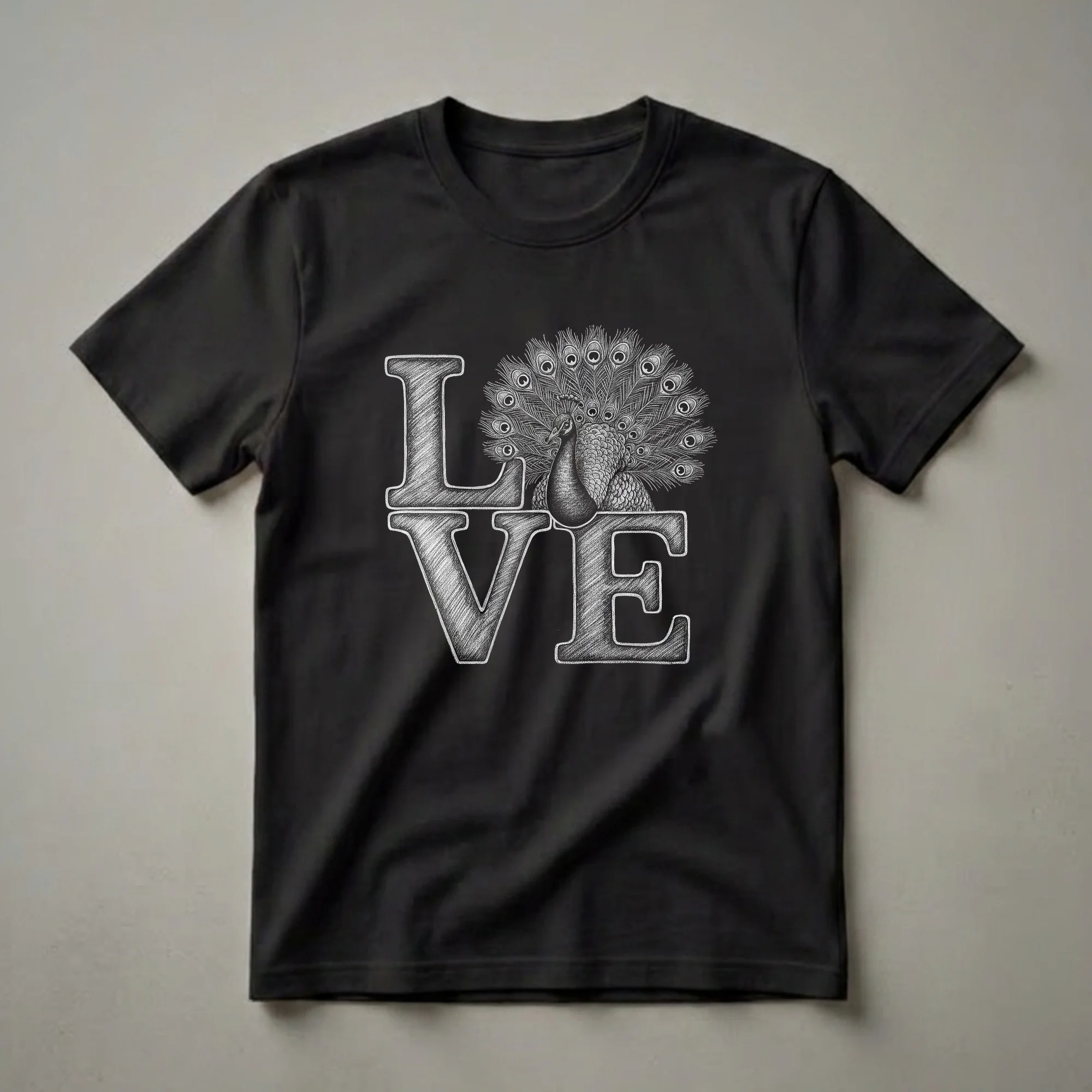 Peacock lovers will adore this striking graphic t-shirt featuring a detailed sketch of the word 'LOVE' with a magnificent peacock in place of the letter 'O'. The peacock is depicted with its elaborate train of feathers fanned out, showcasing the intricate eye patterns. This artistic rendering captures the bird's regal beauty and vibrant display. Peafowl, native to South Asia, are renowned for their iridescent plumage and the male's impressive courtship dance. This tee is a thoughtful gift for anyone who appreciates avian beauty or seeks a unique addition to their wardrobe. Wear this shirt to nature walks, birdwatching excursions, or casual outings to express your passion for these stunning creatures. It's a staple piece for any bird enthusiast's collection, offering a unique way to showcase your appreciation for these magnificent birds.