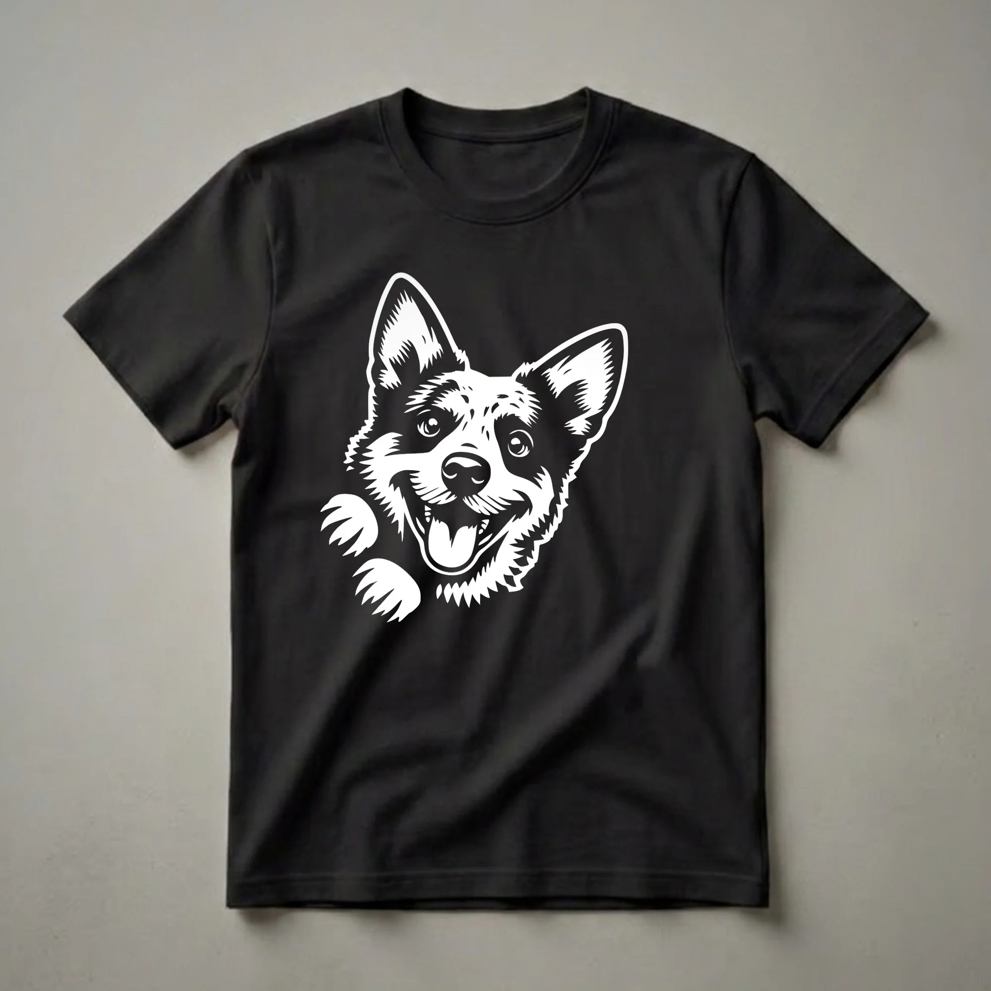 Australian Cattle Dog owners know the intelligence and boundless energy of their beloved pets. This graphic tee features a striking white illustration of an Australian Cattle Dog's face peeking from the side, its tongue out in a happy pant. The design captures the breed's alert ears and expressive eyes, making it instantly recognizable to anyone familiar with this spirited working dog. Australian Cattle Dogs, also known as Blue Heelers or Red Heelers, were originally bred in Australia for herding cattle over vast distances. Their loyalty and trainability make them exceptional companions for active individuals and families. This shirt is a fantastic way for ACD enthusiasts to wear their passion. It makes a thoughtful gift for the Australian Cattle Dog mom or dad in your life, someone who cherishes their loyal and playful canine friend. This t-shirt is a go-to tee for casual outings, dog park visits, or simply relaxing at home with your furry companion. Celebrate the unique bond you share with your Australian Cattle Dog with this eye-catching apparel.