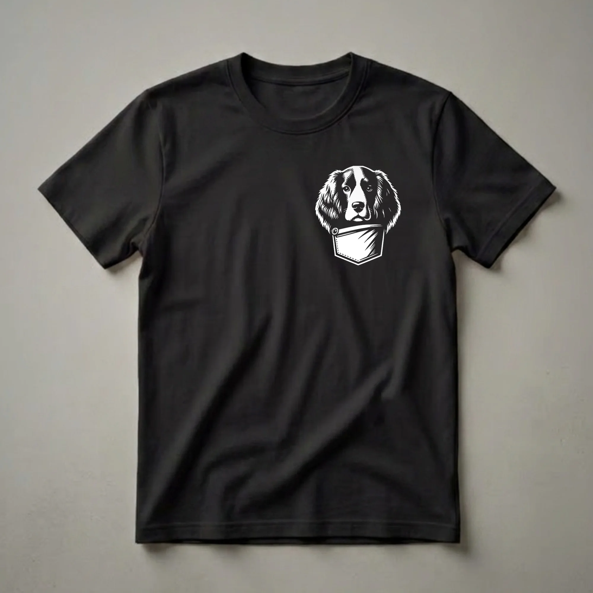English Springer Spaniel owners who adore their energetic and friendly companions will reach for this unique graphic tee. The striking black and white design features the head of an English Springer Spaniel peeking out from a stylized shirt pocket, showcasing the breed's distinctive floppy ears and expressive eyes. Known for their enthusiasm and eagerness to please, these dogs are a joy to have around. This shirt is a thoughtful gift for any dog mom or dad who cherishes their Springer Spaniel. It's a staple in the collection for casual outings, walks in the park, or simply relaxing at home. The eye-catching graphic makes a statement without being overly loud, a thoughtful choice for everyday wear. Celebrate your bond with your beloved canine by sporting this distinctive English Springer Spaniel t-shirt. It’s a conversation starter for fellow dog enthusiasts and a clear declaration of your affection for this wonderful breed. This tee works well for anyone who appreciates detailed, artistic dog portraits.