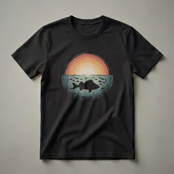 Anglers who appreciate the serene beauty of a lakeside sunset will reach for this striking graphic tee. The design features a detailed silhouette of a large perch fish swimming in calm waters, surrounded by smaller fish and reeds. Above the water, a vibrant sunset is depicted with brushstroke-like layers of orange, red, and yellow, creating a retro, artistic feel. Perch, known for their distinctive spiny dorsal fins and aggressive feeding habits, are a popular catch for sport fishermen across North America. These fish typically inhabit freshwater lakes and rivers, often found near vegetation and structures where they can ambush prey. This shirt is a thoughtful gift for the fisherman in your life, great to wear on a fishing trip, to a casual outing, or simply while relaxing at home. It captures the essence of a peaceful moment by the water, making it a staple for any outdoor enthusiast's wardrobe. The vintage-inspired art style adds a unique touch, appealing to those who enjoy both the thrill of the catch and the tranquility of nature. This t-shirt is a great way to express your passion for fishing and the great outdoors.