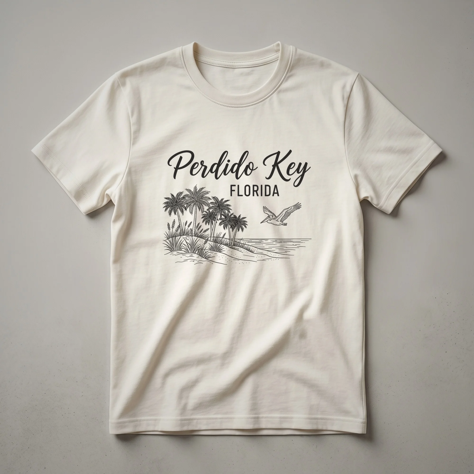 Perdido Key, Florida, a barrier island known for its pristine white sand beaches and clear emerald waters, is beautifully captured in this sketch art design. This tee features a serene coastal landscape with iconic palm trees swaying gently, native dune grasses, and the tranquil Gulf of Mexico stretching towards the horizon. A lone pelican soars gracefully in the sky, a common sight along Florida's coastline. Perdido Key is part of the Gulf Coast, renowned for its natural beauty and recreational opportunities, including fishing and boating. This graphic shirt is a wonderful way for residents and visitors to commemorate their time spent on this picturesque stretch of the Florida Panhandle. It makes a thoughtful gift for anyone who cherishes memories of Florida's Gulf Coast or dreams of visiting its beautiful shores. Wear this shirt to remember your vacation or to show your state pride. This comfortable tee is a staple for any Florida enthusiast's wardrobe, a thoughtful choice for casual outings or beach days.
