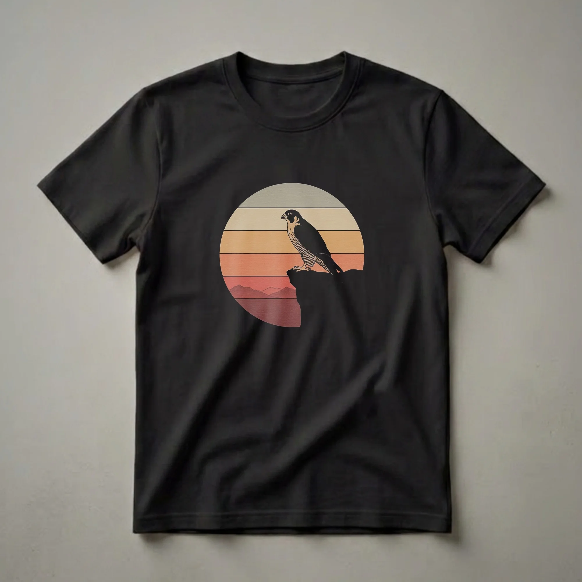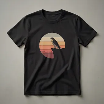 Peregrine falcon owners and birdwatching enthusiasts will appreciate this striking graphic tee featuring a vintage sunset design. The artwork depicts a peregrine falcon perched regally on a rocky cliff, silhouetted against a retro-style sunset with horizontal bands of color. Peregrine falcons are renowned for their incredible speed, reaching over 200 miles per hour during their hunting dives, making them the fastest animal on Earth. This shirt is a thoughtful gift for any nature lover or hiker who admires these magnificent birds. Wear this unique t-shirt on your next outdoor adventure or casual outing to express your passion for wildlife. This eye-catching shirt is a staple for anyone who cherishes the wild beauty of birds of prey. It's a go-to tee for expressing your connection to nature.
