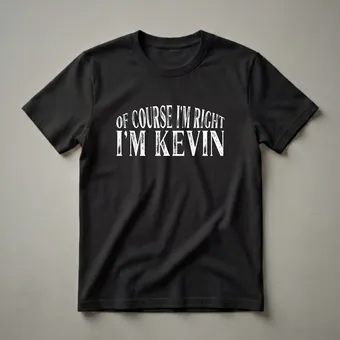 - Features bold, distressed white text on a black t-shirt proclaiming 'OF COURSE I'M RIGHT I'M KEVIN'.