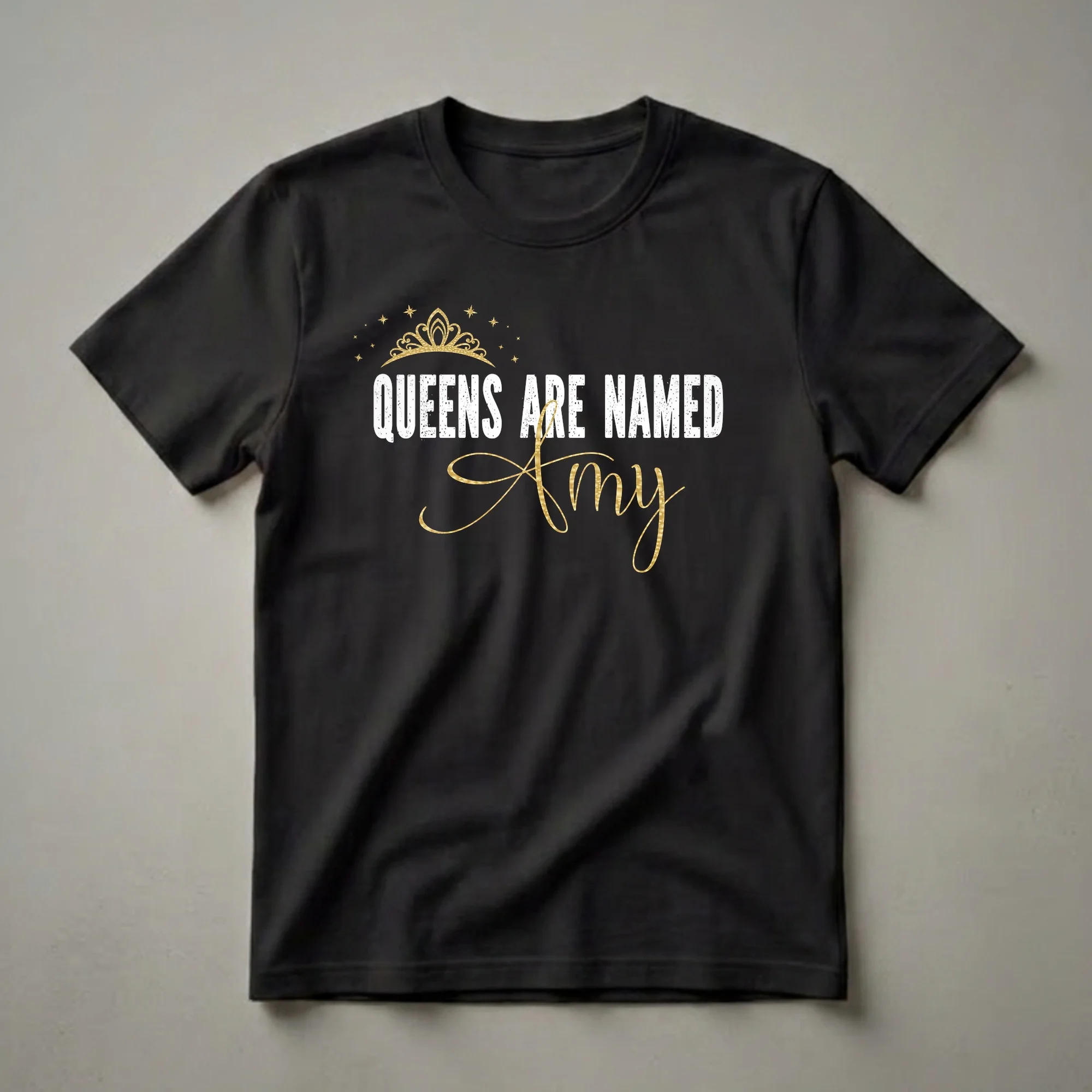 - Features a regal gold crown and sparkling stars graphic over distressed text proclaiming 'QUEENS ARE NAMED AMY'.