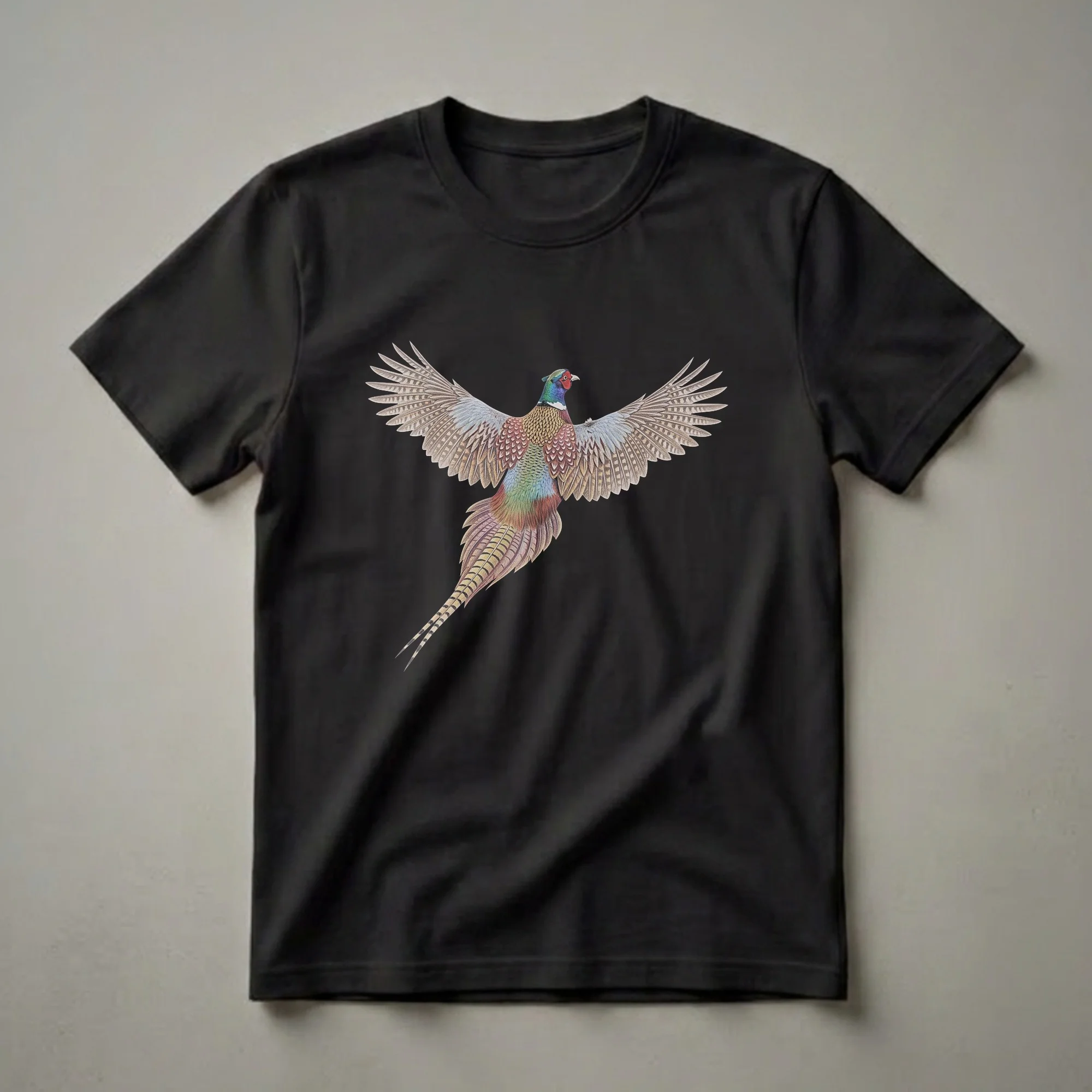 Nature lovers and wildlife enthusiasts will appreciate the intricate detail of this vintage-style pheasant drawing. The artwork captures a male pheasant in mid-flight, its wings spread wide, showcasing the bird's vibrant plumage. Pheasants, known for their colorful feathers and distinctive calls, are native to Asia but have been introduced worldwide for sport hunting. This graphic tee features a realistic depiction of the bird, highlighting the iridescent greens and blues on its head and neck, the warm browns and golds of its body, and the long, striped tail feathers. This shirt is a thoughtful gift for anyone who enjoys birdwatching, hiking, or simply admiring the natural world. Wear this unique t-shirt on your next outdoor adventure or casual outing to express your passion for avian wildlife. It's a staple piece for any nature lover's wardrobe, offering a touch of the wild to your everyday style.