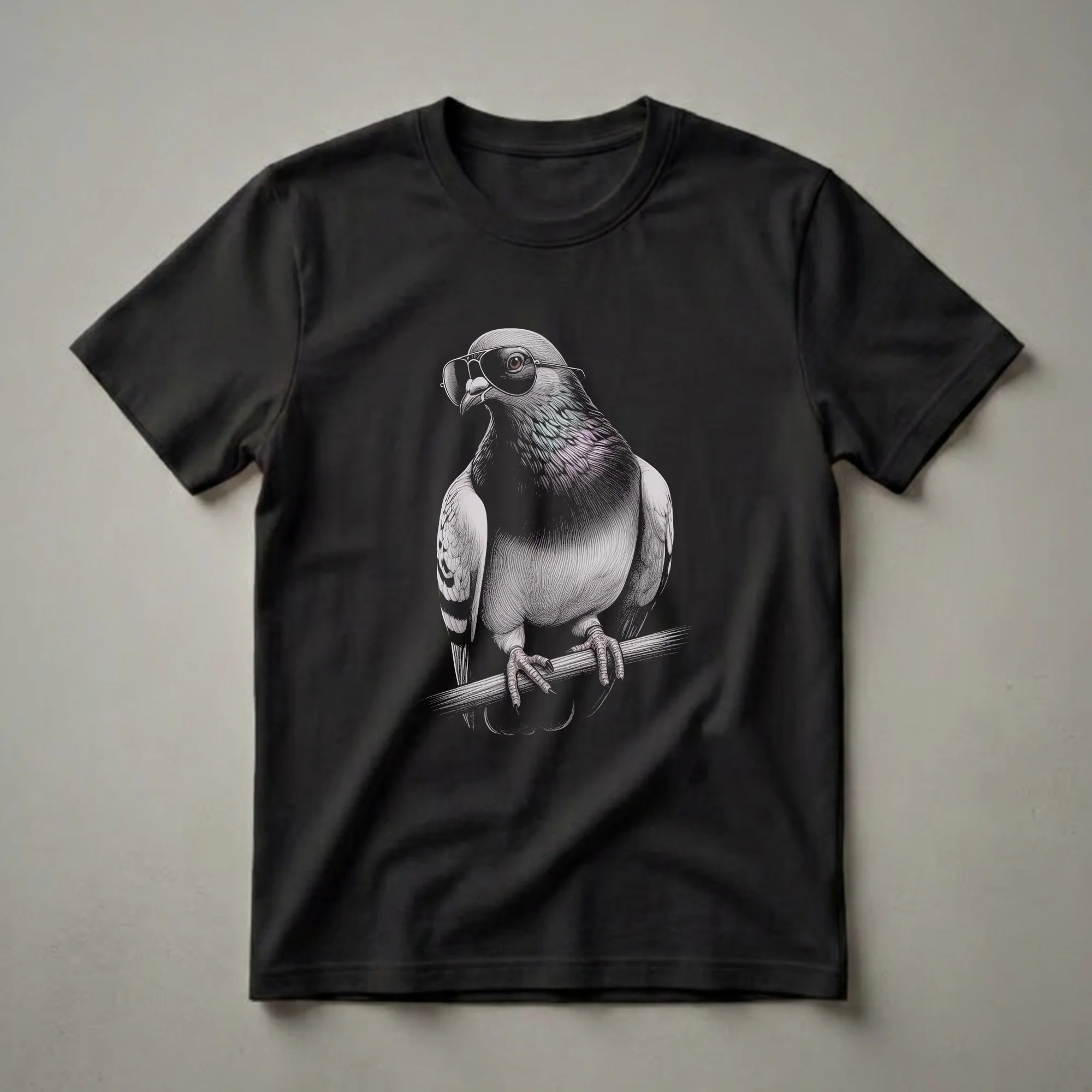 Pigeon lovers and admirers of unique avian art will appreciate this striking t-shirt. The design showcases a detailed, vintage-style drawing of a pigeon perched on a branch, complete with cool aviator sunglasses. Pigeons, also known as rock doves, are one of the most common bird species found in urban environments worldwide, known for their adaptability and intelligence. This graphic tee captures a quirky and stylish representation of this familiar bird. It makes a thoughtful gift for anyone who appreciates wildlife art, birdwatching, or simply has a soft spot for these urban flyers. Wear this shirt to your next nature walk, casual outing, or to a gathering of fellow bird enthusiasts. It's a conversation starter and a way to express your love for feathered friends with a touch of retro flair. This unique apparel is a staple for any bird lover's collection.