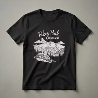 Colorado mountain lovers will reach for this striking graphic tee featuring a vintage-style pencil drawing of Pikes Peak. The artwork captures the majestic mountain range under a full moon, with dramatic clouds and a dense forest of pine trees. In the foreground, snow-dusted rocks and sparse vegetation add to the rugged, natural beauty. Pikes Peak, one of Colorado's most famous fourteeners, stands as a symbol of the state's breathtaking natural landscapes and outdoor adventure opportunities. This t-shirt is a thoughtful gift for anyone who has hiked its trails, driven the scenic highway, or simply cherishes the iconic views of the Rocky Mountains. Wear this shirt on your next outdoor excursion, to a casual gathering, or while reminiscing about your travels in the Centennial State. It's a staple piece for any wardrobe celebrating the spirit of Colorado.