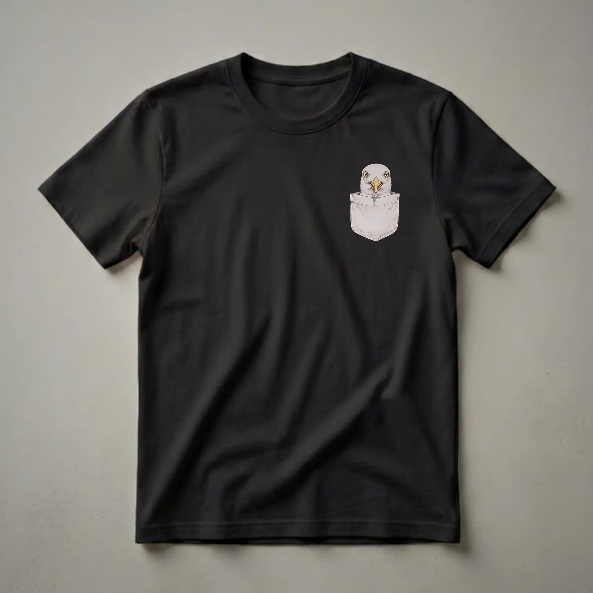 Seagulls, known for their adaptability and presence along coastlines worldwide, are captured in a charming vintage drawing on this unique t-shirt. This eye-catching graphic features a detailed sketch of a seagull's head peeking out from a shirt pocket, rendered in a classic pencil-art style. These intelligent birds are often found scavenging and are a common sight in urban and coastal environments, symbolizing freedom and resilience. This tee is a staple for bird watchers, wildlife enthusiasts, or anyone who appreciates the natural world and unique apparel. It makes a thoughtful gift for friends or family who have a fondness for these coastal birds. Wear this shirt to your next nature walk, casual outing, or while enjoying a day by the sea. It’s a conversation starter for any bird lover.