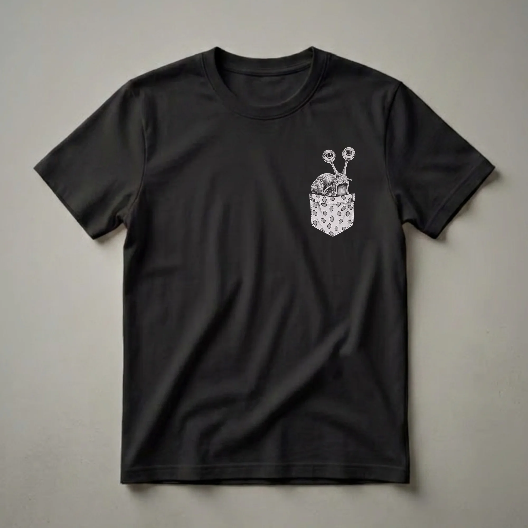 Nature lovers and admirers of intricate art will appreciate this striking t-shirt featuring a detailed pencil drawing of a snail peeking out from a faux pocket. The snail's large, expressive eyes and textured shell are rendered with remarkable detail, giving the artwork a vintage feel. The pocket itself is adorned with a subtle polka-dot pattern, adding a whimsical touch to the overall design. Snails, known for their slow and steady pace, are fascinating gastropod mollusks found in diverse habitats worldwide, from damp forests to arid deserts. This shirt is a thoughtful gift for the snail mom or dad in your life, or for anyone who finds beauty in the smaller creatures of the natural world. It's a conversation starter, great to wear on a hike, to a nature photography club meeting, or simply for a casual day out. This unique graphic tee offers a distinctive way to express your appreciation for wildlife and detailed artistic expression, making it a go-to tee for those who love the outdoors and unique apparel.