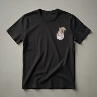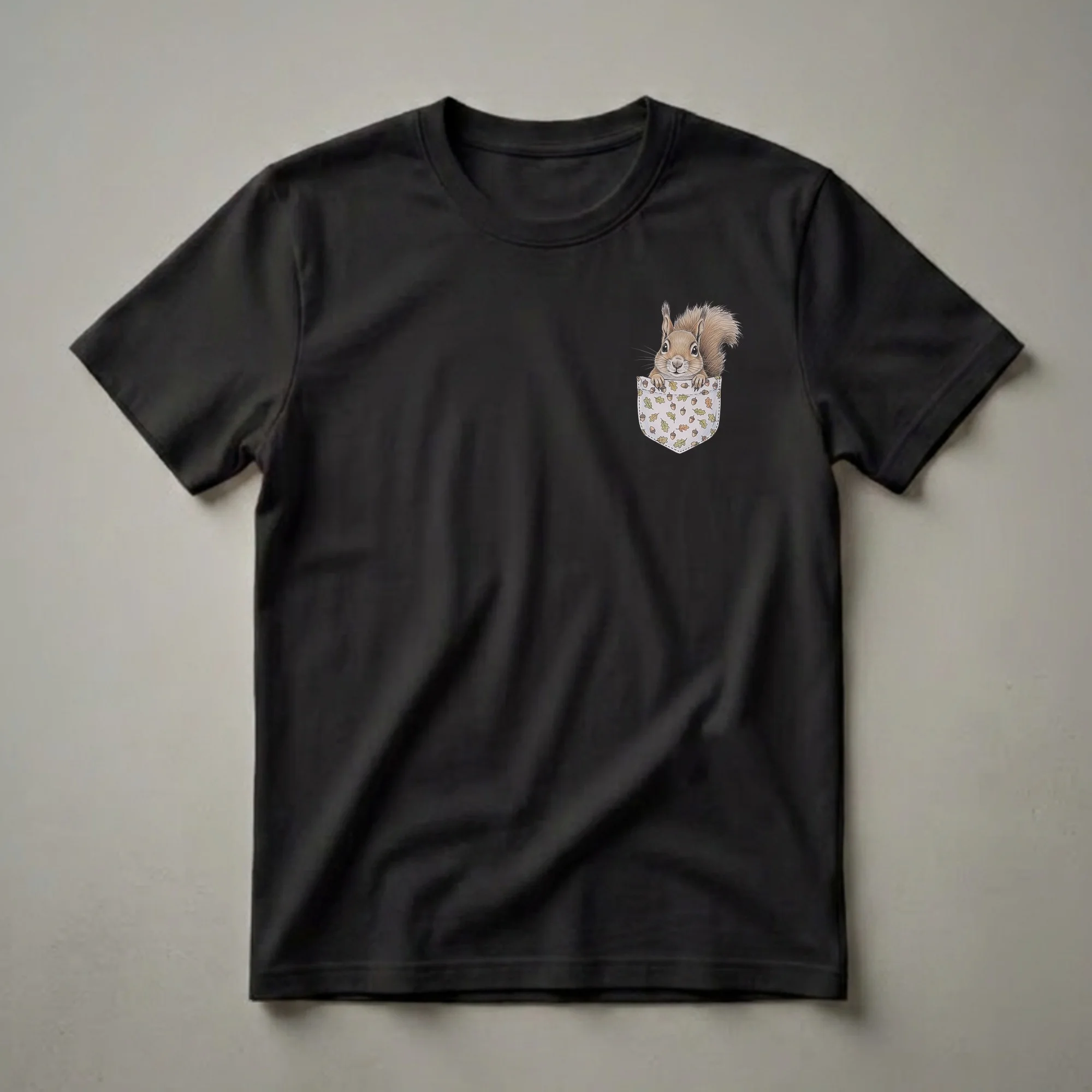 Squirrel enthusiasts will reach for this unique t-shirt featuring a detailed, realistic drawing of a squirrel peeking out from a pocket. The pocket itself is adorned with a charming pattern of acorns and oak leaves, evoking the natural habitat of these busy mammals. Squirrels, known for their agility and hoarding instincts, are a common sight in forests and urban parks, often recognized by their bushy tails and quick movements. This graphic tee is a wonderful way for any admirer of wildlife to express their appreciation for these fascinating creatures. It makes a thoughtful gift for anyone who enjoys nature, hiking, or simply finds joy in observing animals in their environment. Wear this shirt on your next outdoor adventure or casual outing to spark conversations about your passion for the natural world. This eye-catching design is a staple for any nature lover's wardrobe.