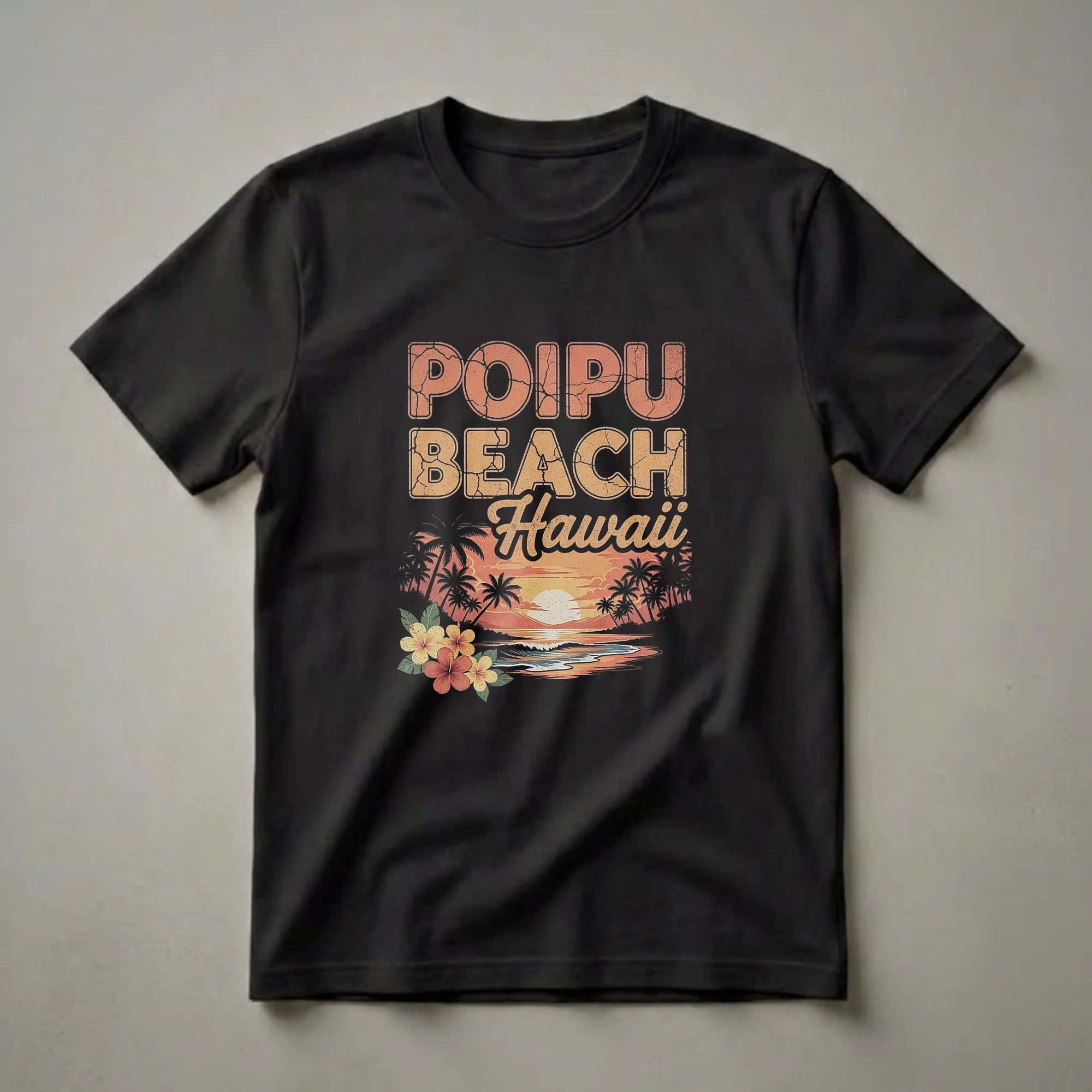 Poipu Beach, located on the southern shore of Kauai, Hawaii, is renowned for its stunning coastline and vibrant sunsets. This graphic tee captures that iconic island vibe with a retro design. The words "POIPU BEACH Hawaii" are emblazoned across the top in a distressed, vintage font, evoking a sense of nostalgia. Below, a picturesque sunset scene unfolds, complete with silhouetted palm trees lining the shore and a radiant sun dipping below the horizon. Gentle waves roll onto the beach, reflecting the warm hues of the sky. In the foreground, a cluster of colorful hibiscus flowers adds a touch of tropical beauty. This t-shirt is a thoughtful gift for anyone who cherishes memories of Kauai or dreams of visiting the Hawaiian Islands. It's a staple in the collection for island travelers and beach enthusiasts. Wear this shirt to relive your favorite Hawaiian vacation moments or to inspire your next island getaway. This apparel is a go-to tee for casual outings, beach days, or simply relaxing with a tropical mindset.