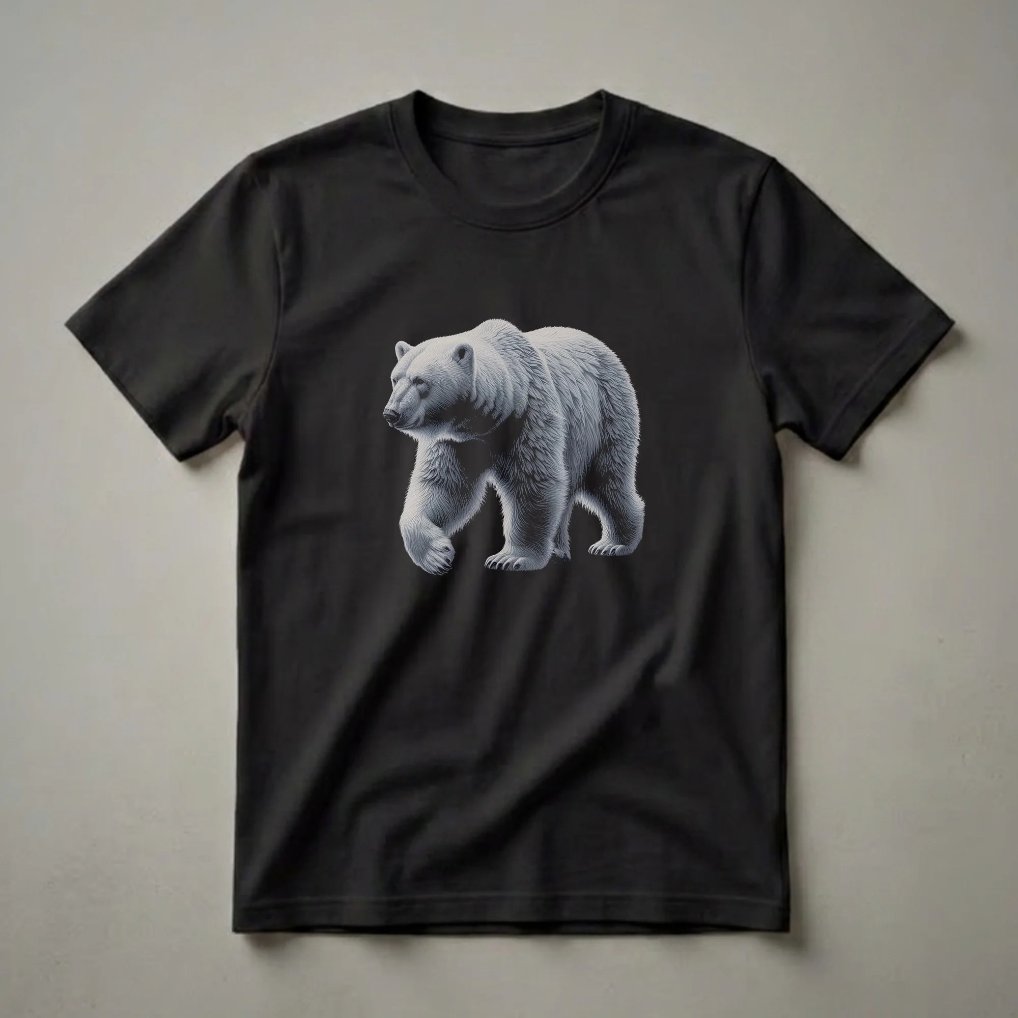 Wildlife enthusiasts who appreciate the raw beauty of the Arctic will reach for this striking polar bear graphic tee. The design features a highly detailed, monochromatic drawing of a polar bear in motion, captured with incredible texture and depth. Its fur appears almost tangible, showcasing the artist's skill in rendering the majestic creature against a stark black background. Polar bears, scientifically known as Ursus maritimus, are the largest land carnivores and are uniquely adapted to life in the harsh Arctic environment, with thick fur and a layer of blubber to keep them warm. This t-shirt serves as a wearable tribute to these magnificent animals, making it a thoughtful gift for anyone who admires their resilience and power. Whether you're hiking in cooler climates or simply want to express your connection to the natural world, this shirt is a conversation starter. It's a staple in the collection for those who champion conservation and the preservation of wild spaces. Wear this tee to express your passion for the wild and its inhabitants.