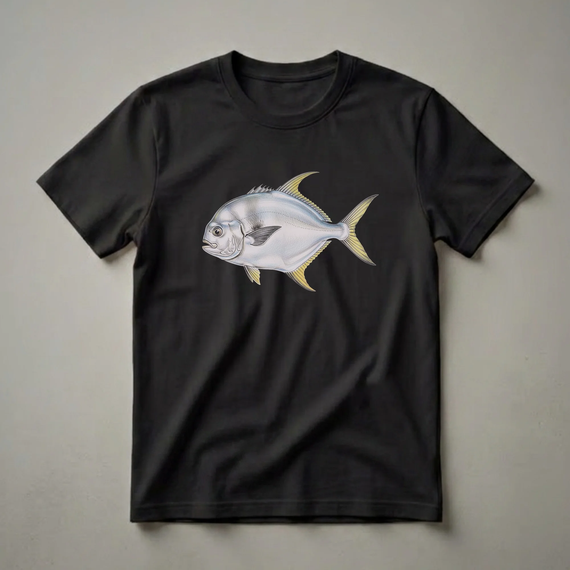 Anglers and marine life enthusiasts will appreciate this detailed Pompano fish drawing t-shirt. The artwork features a realistic depiction of a Pompano, known for its silvery body and distinctive fins, rendered in a vintage art style. Pompano are fast-swimming game fish found in coastal waters worldwide, often near sandy beaches and inlets, where they feed on small invertebrates. This graphic tee is a staple in the collection for anyone who enjoys surf fishing or appreciates the beauty of ocean dwellers. It makes a thoughtful gift for the fisherman in your life or for someone who cherishes the marine environment. Wear this shirt on your next fishing trip or to a casual outing to display your passion for the sea. This eye-catching design celebrates the vibrant world beneath the waves.