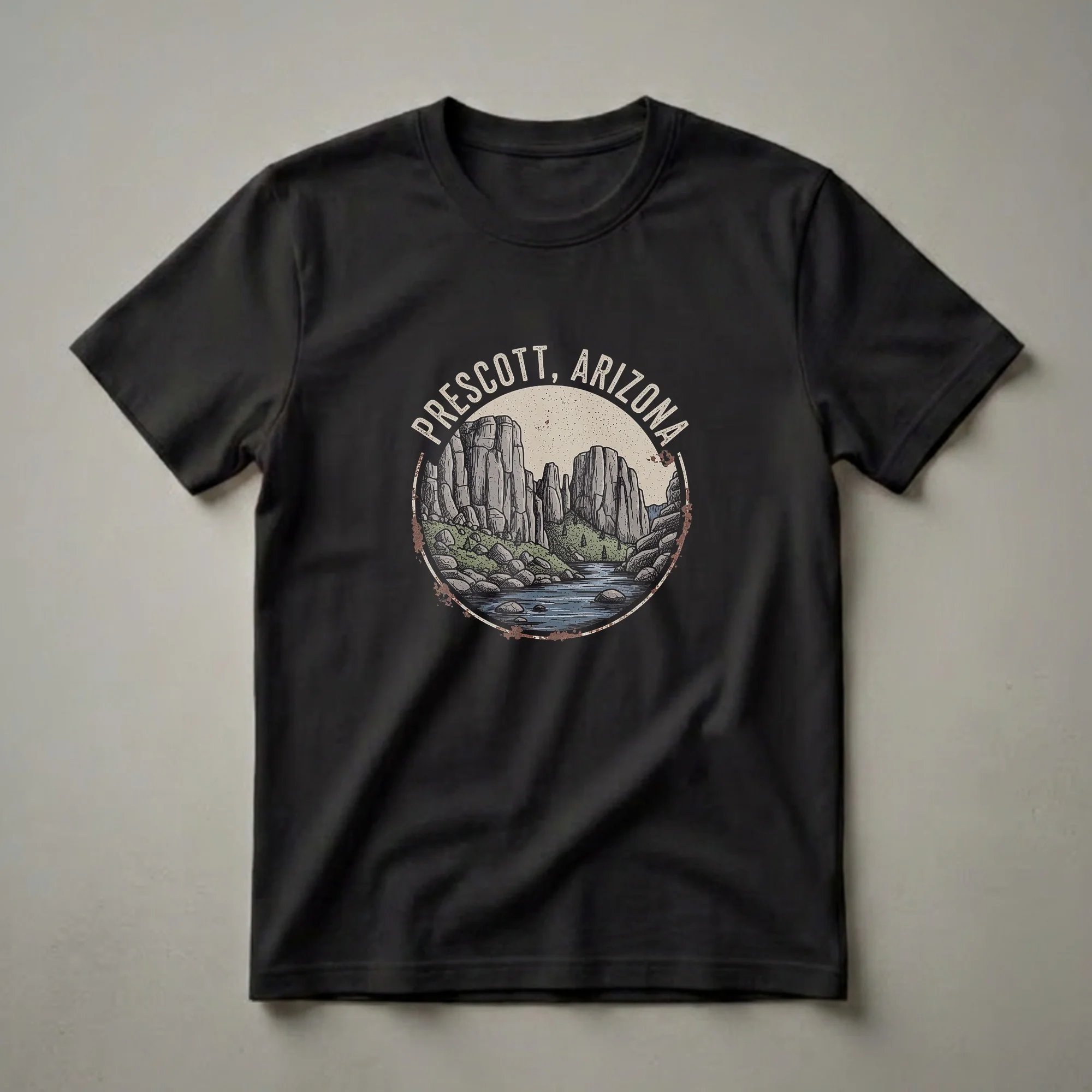 Prescott, Arizona residents and visitors who appreciate the rugged beauty of the Southwest will reach for this unique graphic tee. The design captures the iconic landscape of Prescott, known for its stunning granite dells and scenic beauty. This t-shirt features a hand-drawn illustration of a canyon with towering rock formations, a winding river, and lush green terrain, all enclosed within a circular emblem. The vintage aesthetic, complete with distressed textures, evokes a sense of nostalgia for this historic Arizona city. Prescott, established in 1864, served as Arizona's territorial capital and retains much of its historic charm. This apparel is a thoughtful gift for anyone who has explored the trails around Thumb Butte or enjoyed the cool waters of Watson Lake. Wear this shirt to a local brewery, a hike in the Prescott National Forest, or simply as a reminder of your favorite Arizona getaway. It's a staple in the collection for those who cherish the natural wonders of the American Southwest.