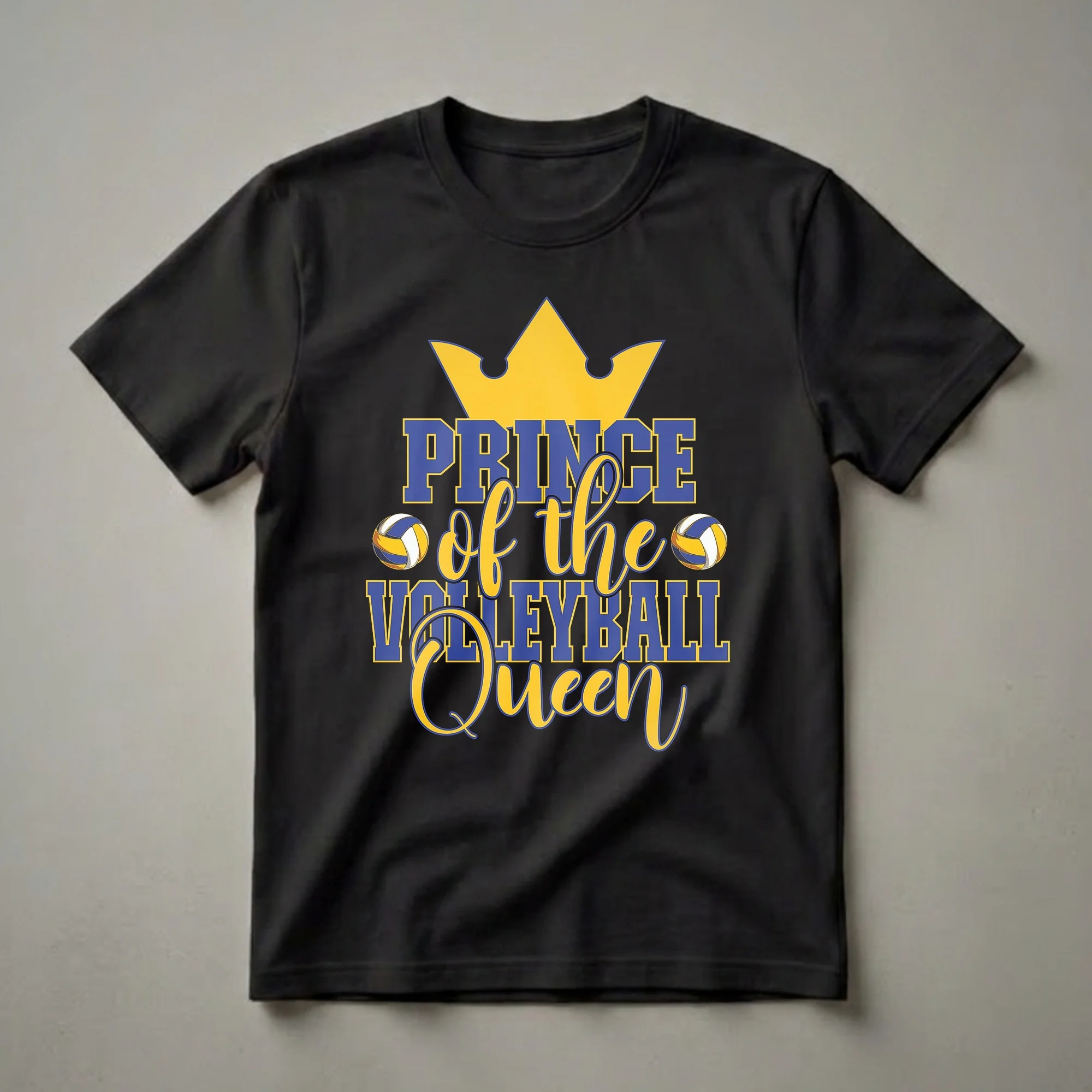 The Volleyball Queen and her Prince can now match with this eye-catching graphic tee. The design features a bold yellow crown atop blue and yellow block lettering that spells out "PRINCE of the VOLLEYBALL Queen." Two realistic volleyballs flank the text, adding a dynamic sports element. This shirt is a thoughtful gift for the son of a dedicated volleyball mom or a young player who looks up to their queen. It's a staple in the collection for any family that loves the sport, making it a go-to tee for game days, team events, or casual wear. Imagine wearing this to cheer on the team or celebrate a birthday, showcasing your family's passion for volleyball. This tee is a fun way for the prince to show support for his volleyball queen, whether she's a player, coach, or superfan.