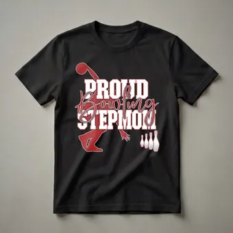 Bowling moms know the thrill of the strike and the strategy behind each frame. This graphic tee proudly declares 'Proud Bowling Stepmom,' celebrating the unique role stepmoms play in supporting their young bowlers. The design features a dynamic illustration of a bowler in action, complete with a bowling ball and pins, rendered in bold red and white against a black background. Bowling is a sport that requires focus, precision, and a bit of flair, and this shirt captures that spirit. It's a fantastic way for a stepmom to show her pride and encouragement at league games, tournaments, or casual bowling nights. This shirt works well for any stepmom who wants to cheer on her stepchild's bowling endeavors. Makes a thoughtful gift for birthdays, holidays, or just to show appreciation for her unwavering support from the sidelines. Wear it to the bowling alley to let everyone know you're the proudest stepmom in the stands.
