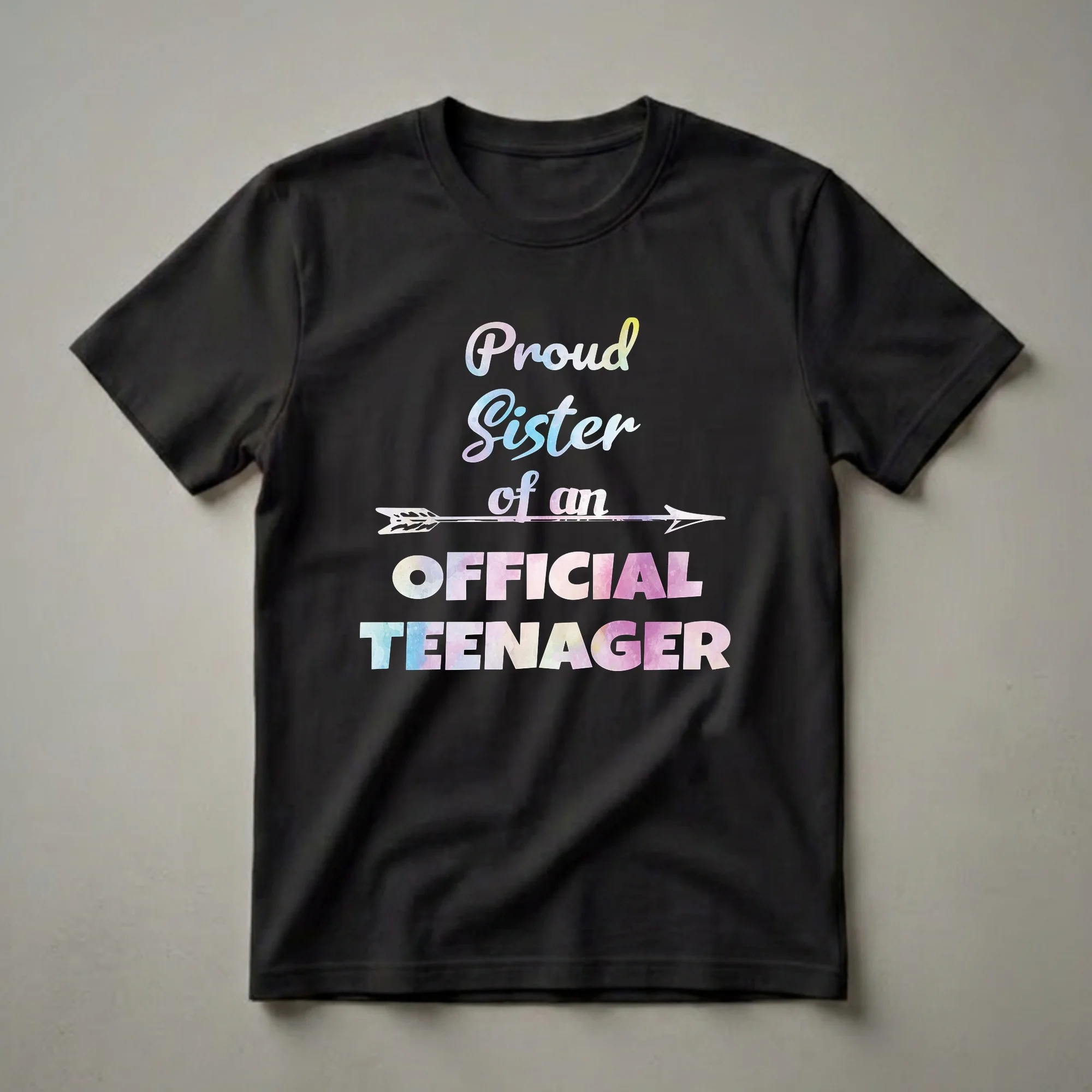 The transition to teenage years is a significant milestone, and this graphic tee captures the pride of a sister whose sibling is officially turning thirteen. The design features bold, uppercase text that reads 'OFFICIAL TEENAGER' in a vibrant watercolor fill, showcasing shades of blue, pink, and yellow. Above this, the words 'Proud Sister of an' are written in a more delicate, script-like font with a similar watercolor effect. A stylized arrow, also with a watercolor fill, pierces through the center, connecting the phrases. This t-shirt is a thoughtful gift for any sister whose brother or sister is celebrating their thirteenth birthday. It's a fantastic way for her to express her excitement and support during this special celebration. She will reach for this tee to wear to the birthday party, family gatherings, or any event marking this important coming-of-age moment. It’s a fun piece of apparel that celebrates family bonds and the exciting journey into the teenage years.