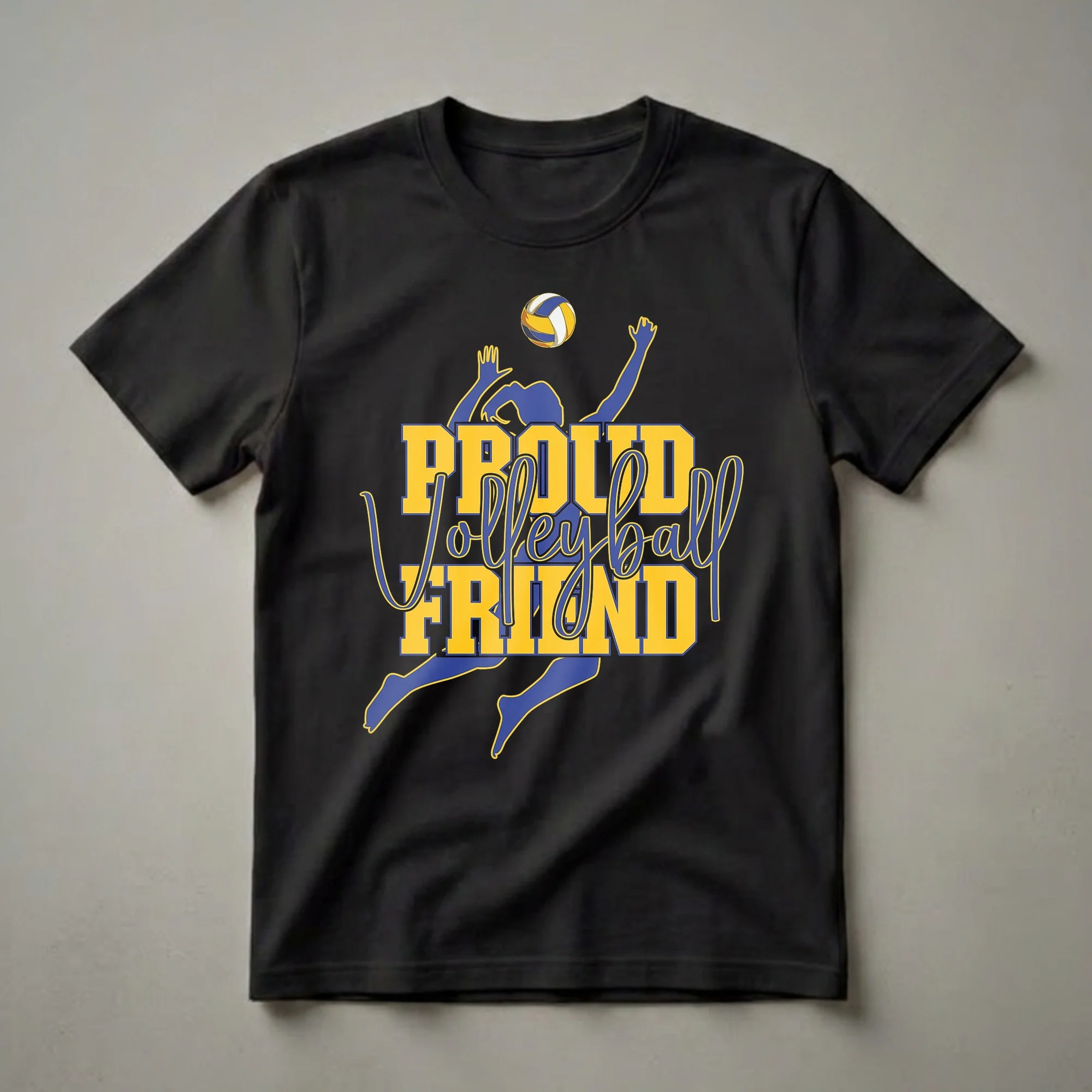 Volleyball moms and dads know the thrill of watching their child compete on the court. This graphic tee proudly declares your status as a 'Proud Volleyball Friend,' a thoughtful choice for anyone who supports a player. The design features a dynamic illustration of a volleyball player in action, leaping to hit the ball, with the bold text 'Proud Volleyball Friend' emblazoned across the front. The vibrant blue and yellow colors pop against a dark background, making a clear statement of your dedication. Volleyball is a sport that requires teamwork, communication, and agility, with players constantly moving to keep the ball in play. Whether you're attending games, practices, or just want to show your pride off the court, this shirt is a comfortable and stylish choice. It makes a thoughtful gift for any parent, sibling, or friend who has a volleyball player in their life. Wear this t-shirt to games, team events, or casual outings to celebrate your connection to the sport and your favorite athlete. This eye-catching shirt is a staple for any dedicated volleyball supporter.