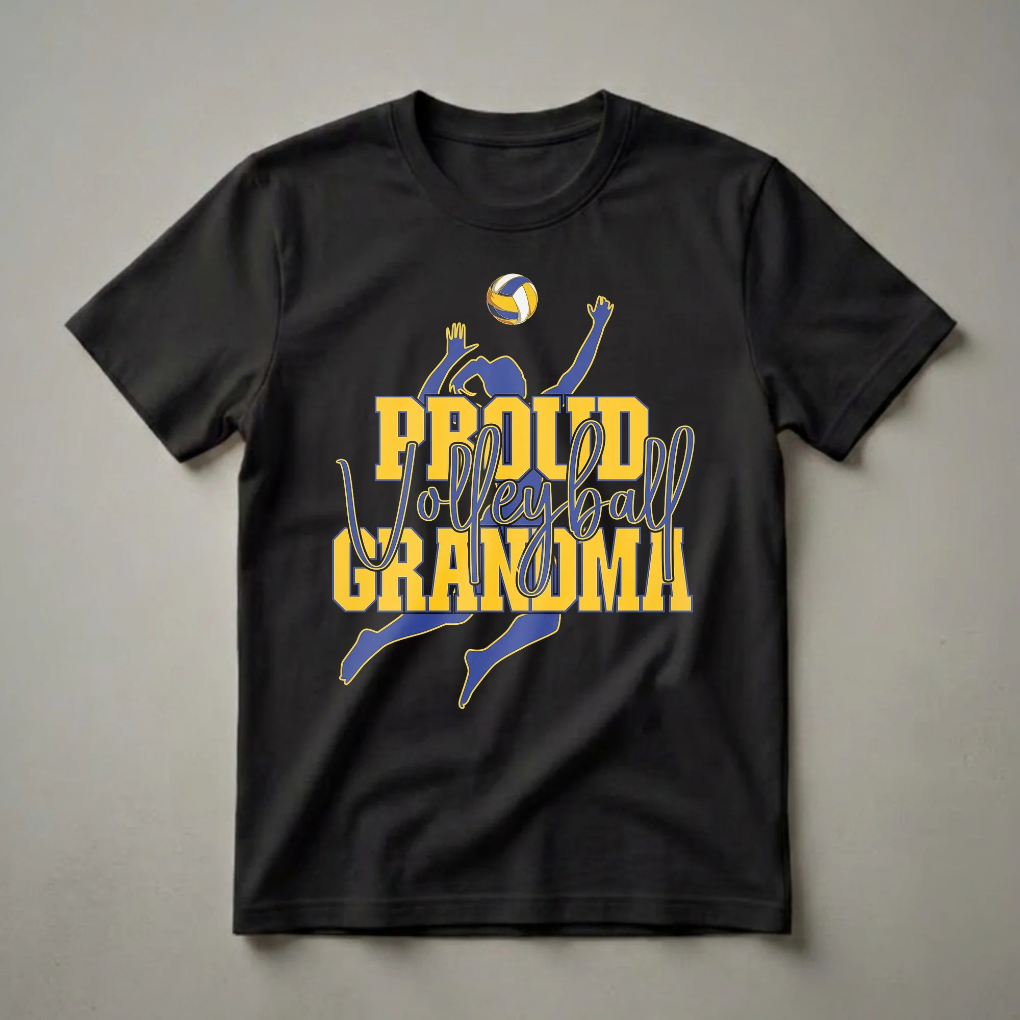 Volleyball grandmas know the thrill of the game, from the serve to the spike. This graphic tee proudly declares your role as a supportive grandma, featuring a dynamic silhouette of a player in action, reaching for the ball. The bold text, 'Proud Volleyball Grandma,' is rendered in a striking combination of gold and blue, mirroring the colors often seen on team uniforms. Volleyball is a sport that demands teamwork, communication, and agility, with players diving and jumping to keep the ball in play. This shirt is for the grandmother who cheers from the sidelines, celebrates every point, and beams with pride at her grandchild's efforts on the court. It makes a thoughtful gift for any grandma who loves to watch her family play. Wear this t-shirt to games, team events, or casual outings to show your unwavering support and love for the sport and your player. It's a staple in the collection for any proud volleyball grandma.