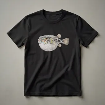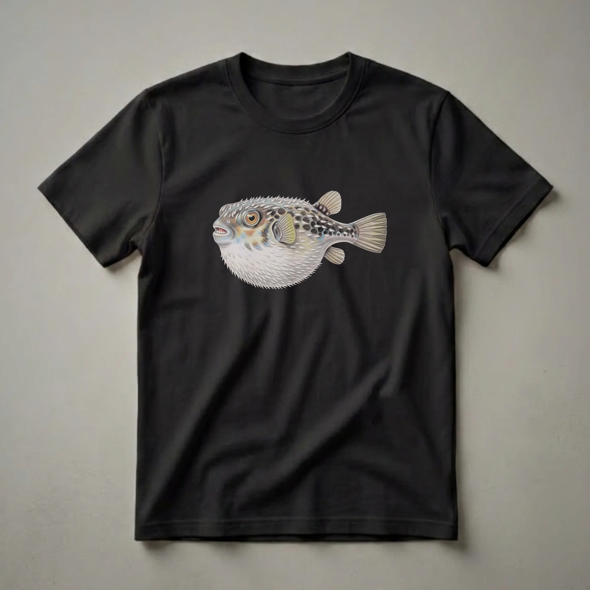 Ocean lovers and marine biology enthusiasts will appreciate the intricate detail of this pufferfish drawing. The artwork captures the unique texture and form of the fish, from its spiky exterior to its distinctive mouth and fins. Pufferfish, also known as blowfish or globefish, are renowned for their ability to inflate their elastic stomachs with water or air, transforming into a ball shape to deter predators. This remarkable defense mechanism is a fascinating aspect of marine biology, highlighting the diverse adaptations found in ocean ecosystems. This graphic tee is a thoughtful gift for anyone who is captivated by the underwater world, whether they are divers, aquarists, or simply admire the beauty of sea creatures. It's a striking piece of apparel that sparks conversation and showcases a passion for marine life. Wear this shirt to the aquarium, on a beach vacation, or during casual outings to express your connection to the ocean. This t-shirt is a staple for those who seek unique and artful representations of aquatic life.