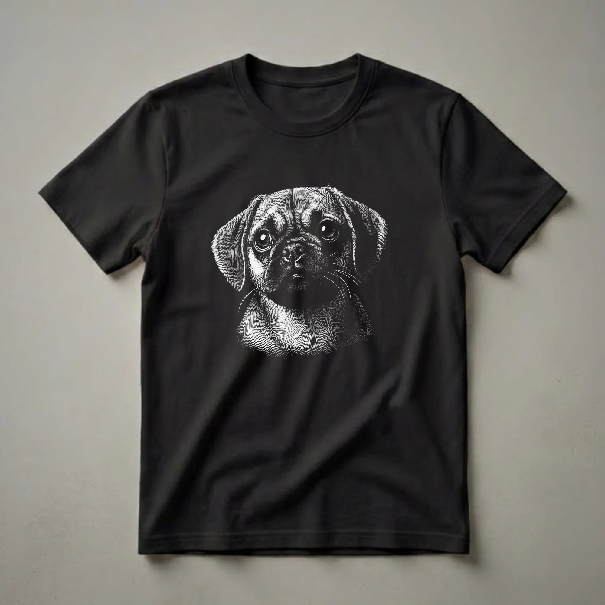 Puggle owners who appreciate unique artistic interpretations of their beloved companions will reach for this eye-catching tee. This shirt features a detailed scratchboard-style illustration of a Puggle's face, rendered in stark black and white against a solid black background. The intricate linework captures the breed's characteristic wrinkled brow, soulful eyes, and distinctive snout, creating a striking visual that dog enthusiasts will admire. Puggles, a crossbreed between a Pug and a Beagle, are known for their playful yet affectionate nature, often inheriting the Pug's charming stubbornness and the Beagle's curious spirit. This graphic tee is a wonderful way for any Puggle mom or dad to express their devotion to their four-legged family member. It makes a thoughtful gift for birthdays, holidays, or just because for the Puggle lover in your life. Wear this unique shirt to casual outings, dog park visits, or while relaxing at home with your furry friend, showcasing your canine pride with artistic flair.