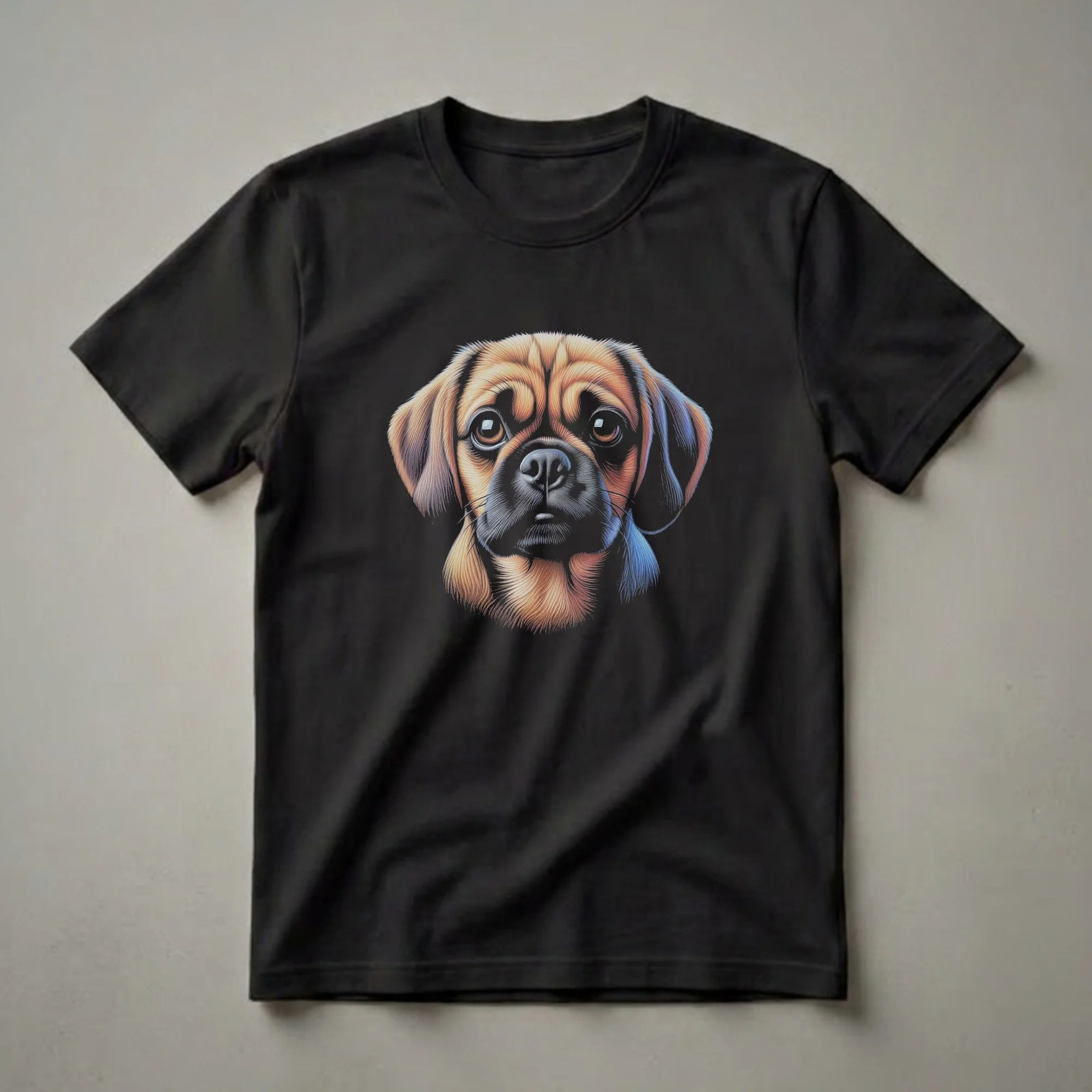 Puggle owners know the unique charm of this mixed breed, a delightful blend of Pug and Beagle. This t-shirt features a striking, detailed drawing of a Puggle's face, rendered in a vintage art style with rich, warm tones and deep shadows. The intricate linework captures the breed's expressive eyes and characteristic wrinkled brow, making it an eye-catching piece for any dog lover. Puggles are known for their playful and affectionate nature, often inheriting the Beagle's curiosity and the Pug's clownish personality. This graphic tee is a wonderful way for Puggle moms and dads to showcase their affection for their furry companions. It makes a thoughtful gift for birthdays, holidays, or just because for the Puggle enthusiast in your life. Wear this unique shirt to dog parks, casual outings, or while relaxing at home with your beloved pet.