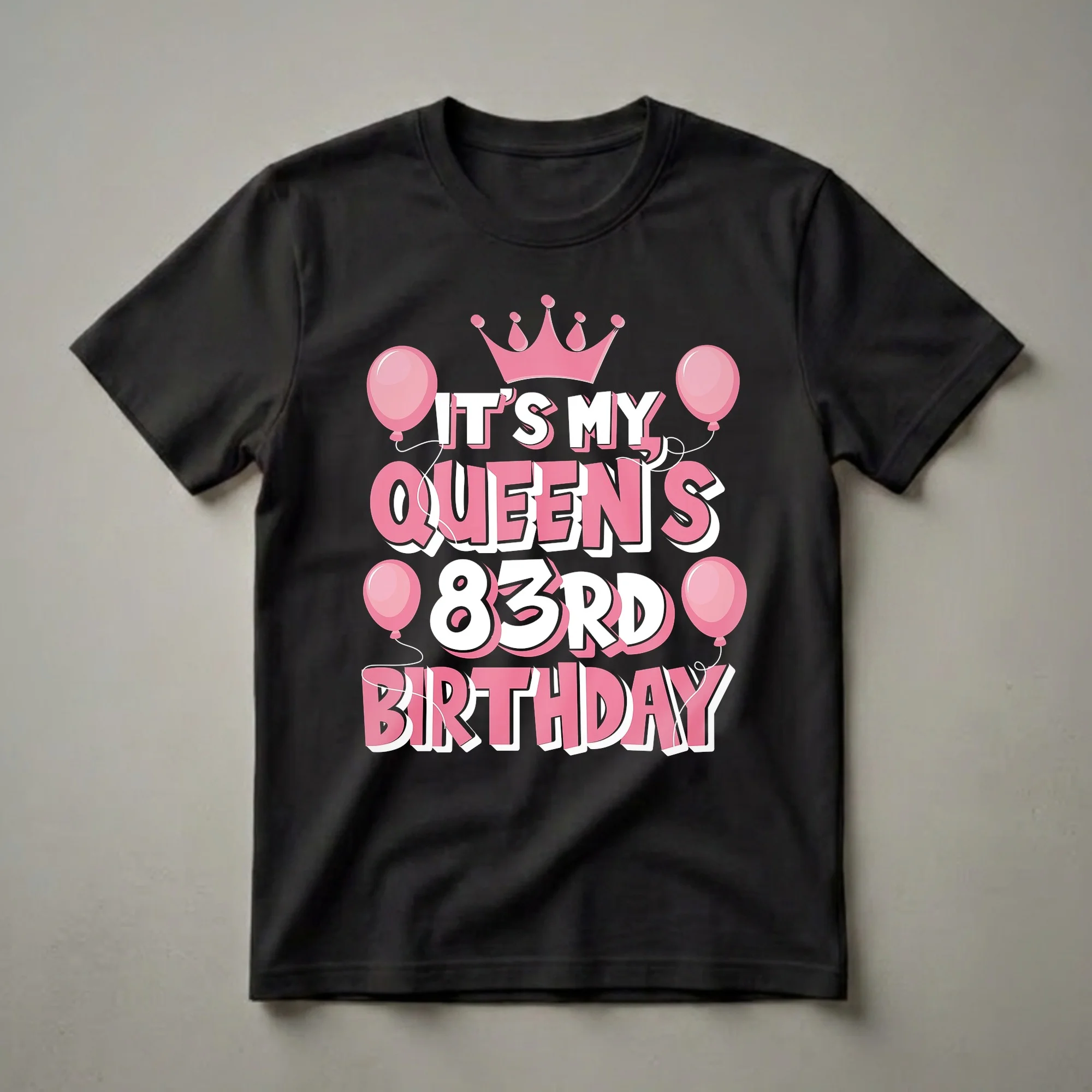 Turning 83 is a significant milestone, and this vibrant graphic tee is a festive way to celebrate the queen in your life. The design features a regal pink crown and cheerful pink balloons, all set against a classic black background. Bold, bubble-style lettering announces 'IT'S MY QUEEN'S 83RD BIRTHDAY' in striking pink and white, making a clear statement for the birthday honoree. This t-shirt is a thoughtful gift for any woman celebrating her 83rd birthday, whether she's a mother, grandmother, or cherished friend. Imagine her delight when she unwraps this special apparel, ready to wear it to her birthday brunch or a family gathering. It's a fun way for her to feel celebrated and special on her big day. This shirt is a go-to tee for anyone looking to add a touch of fun and festivity to an 83rd birthday celebration. It’s a unique way to honor her reign as the queen of the family or friend group. This eye-catching design ensures she’ll stand out and feel like royalty on her special day. This birthday queen shirt is a wonderful present that she will reach for year after year.