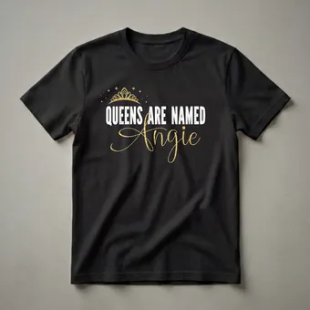 - This Queens Are Named Angie t-shirt features glittering gold script spelling out your regal name.