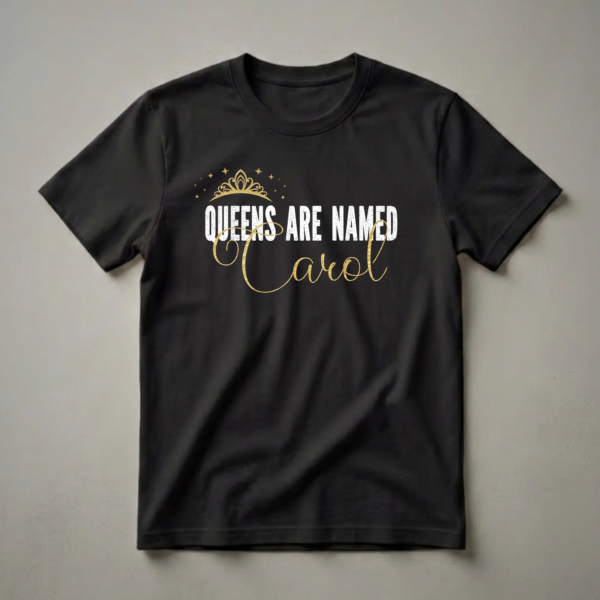 Queens who embody grace and strength are celebrated with this personalized graphic tee. The design features the bold statement 'QUEENS ARE NAMED' in distressed white lettering, overlaid with a flowing, elegant script that spells out 'Carol' in shimmering gold. Above the text, a regal golden crown sparkles with intricate details, surrounded by a scattering of golden stars, evoking a sense of majesty and celebration. This shirt is a wonderful way for any woman named Carol to express her unique identity and feel like royalty on her special day. It makes a thoughtful gift for birthdays, holidays, or just because. Imagine Carol wearing this eye-catching tee to a birthday brunch or a casual get-together, receiving compliments and smiles. This t-shirt is a staple in any wardrobe for those who appreciate a touch of personalized flair and a reminder of their own queenly status. It's a fun and stylish way for Carol to showcase her name with pride.