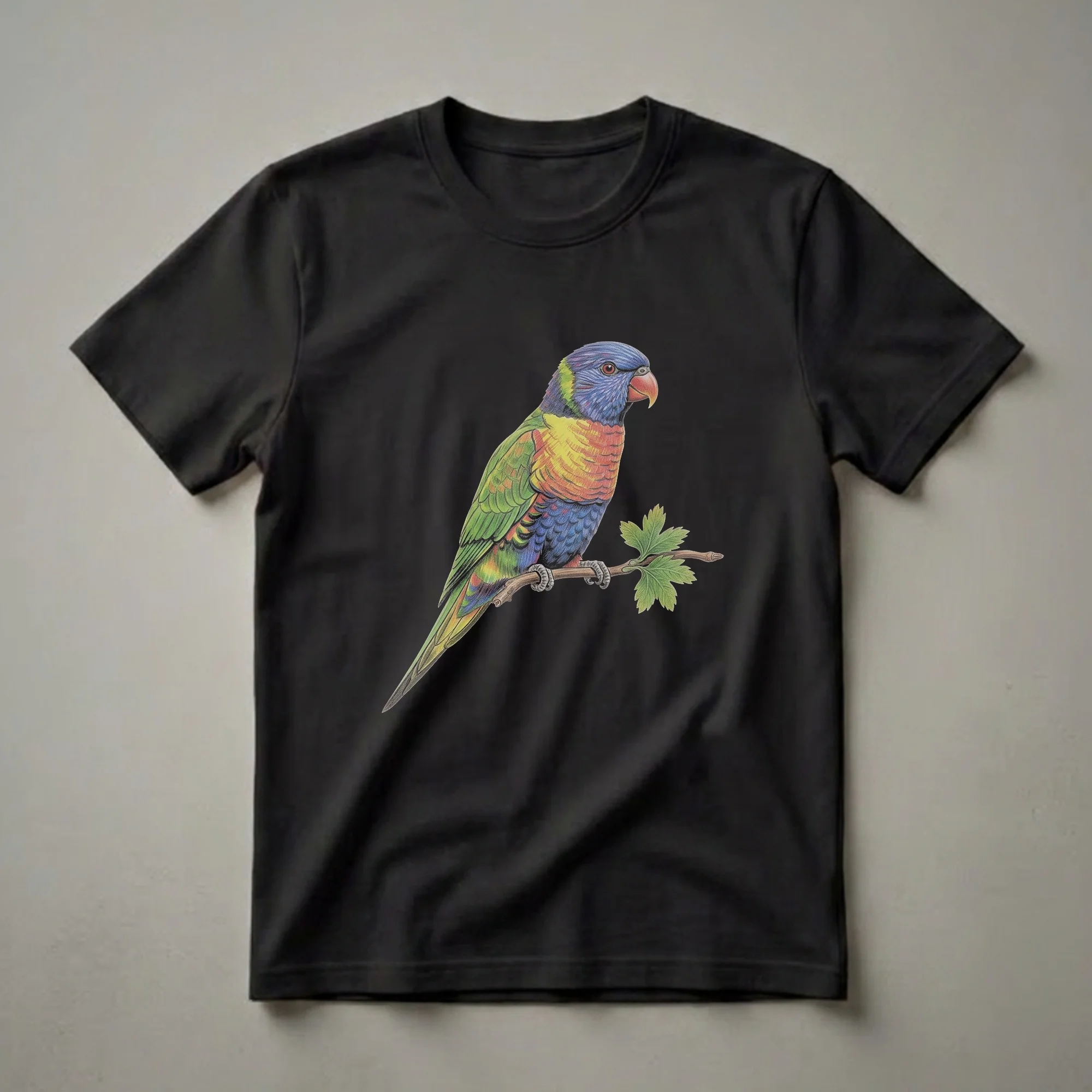 Bird watchers and wildlife enthusiasts will appreciate the intricate detail of this Rainbow Lorikeet drawing, rendered in a vintage art style. The vibrant plumage of the lorikeet is captured with remarkable accuracy, showcasing its characteristic blue face, green wings, yellow and orange chest, and red beak. This striking parrot is perched on a simple branch with a few green leaves, set against a stark black background that makes the bird's colors pop. Rainbow Lorikeets, native to Australia, are known for their energetic nature and their diet of nectar and pollen, which they consume using a specialized brush-tipped tongue. This unique t-shirt makes a thoughtful gift for anyone who admires these colorful birds or enjoys unique wildlife art. It's a go-to tee for casual outings, nature walks, or simply relaxing at home while celebrating your passion for ornithology. Wear this shirt to express your appreciation for the natural world and its most colorful inhabitants.