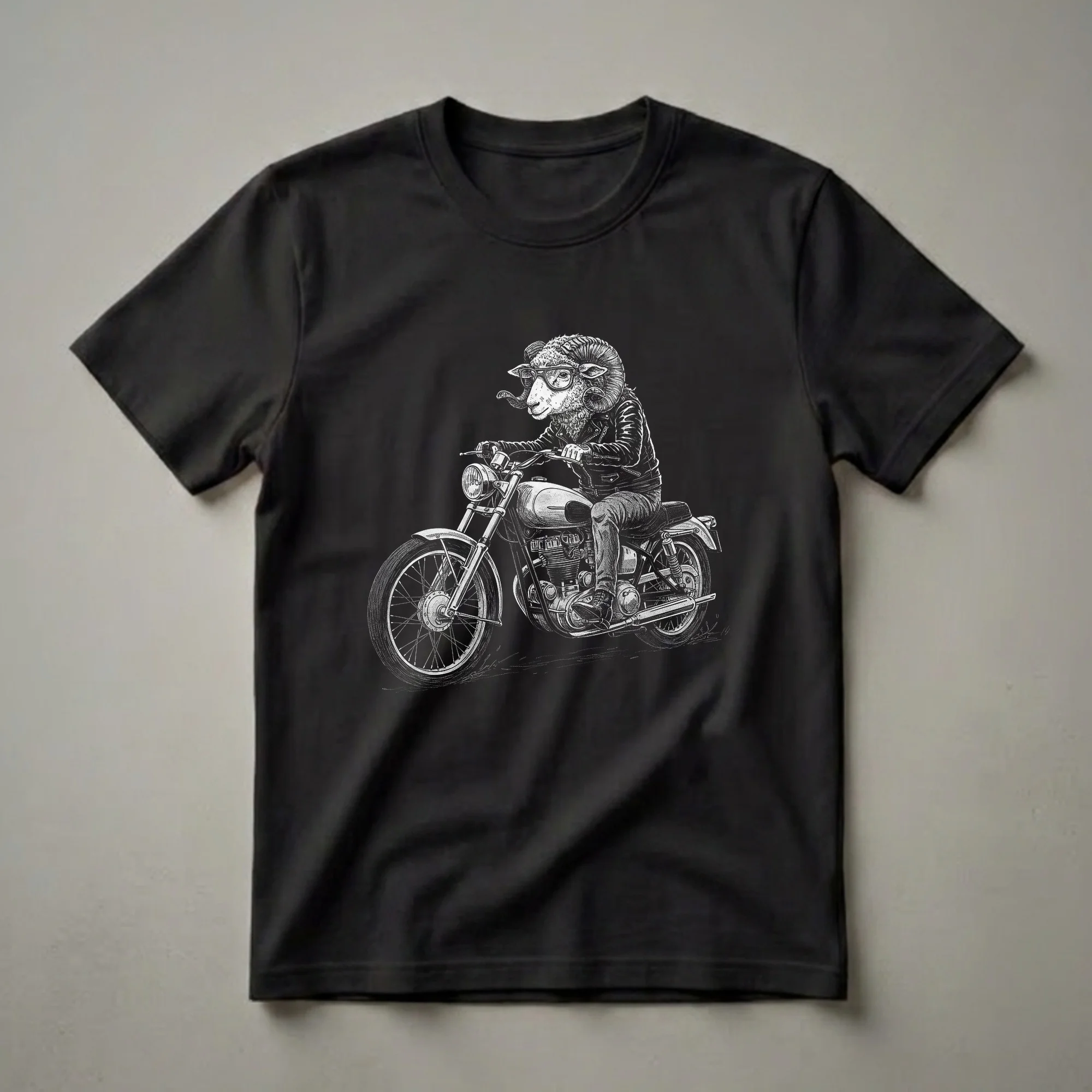 Ram owners who appreciate a bit of rebellious spirit will reach for this eye-catching graphic tee. The striking black and white illustration depicts a ram, complete with impressive curled horns and stylish glasses, confidently riding a vintage motorcycle. Dressed in a classic leather biker jacket and denim jeans, this ram embodies the freedom of the open road. The detailed artwork captures the essence of motorcycle culture, from the gleaming chrome of the bike to the texture of the leather. This t-shirt is a thoughtful gift for any man or woman who identifies with the biker lifestyle or simply enjoys unique, artistic apparel. It's a staple in the collection for those who love animals and the thrill of riding. Wear this shirt to your next bike rally or casual outing to spark conversations and showcase your distinctive style. The intricate linework and bold imagery make this shirt a standout piece for any wardrobe, celebrating both animal charm and the iconic motorcycle aesthetic. It’s a go-to tee for expressing individuality and a passion for two-wheeled adventures.