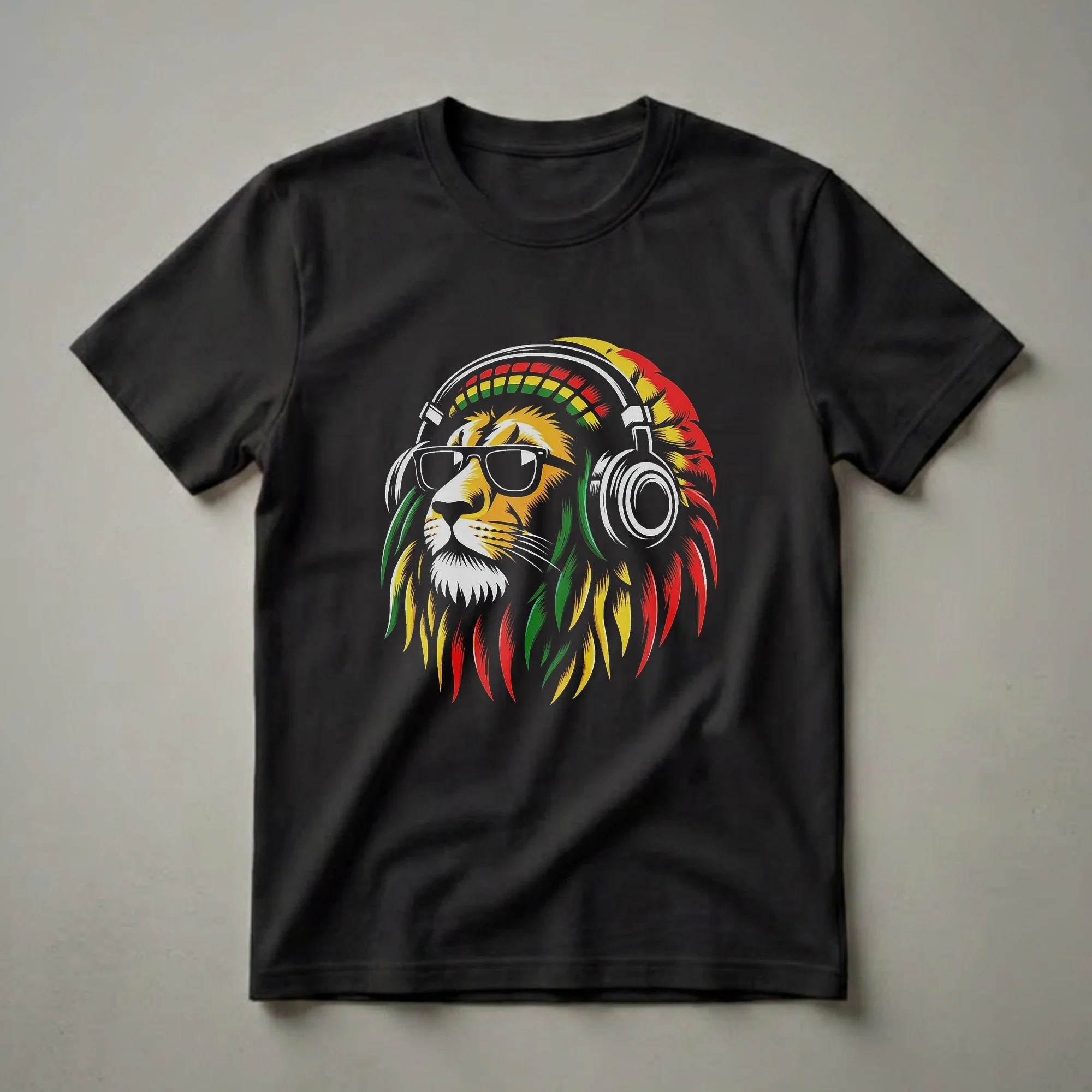 - Features a bold graphic of a lion wearing sunglasses and headphones with Rasta-colored mane.
