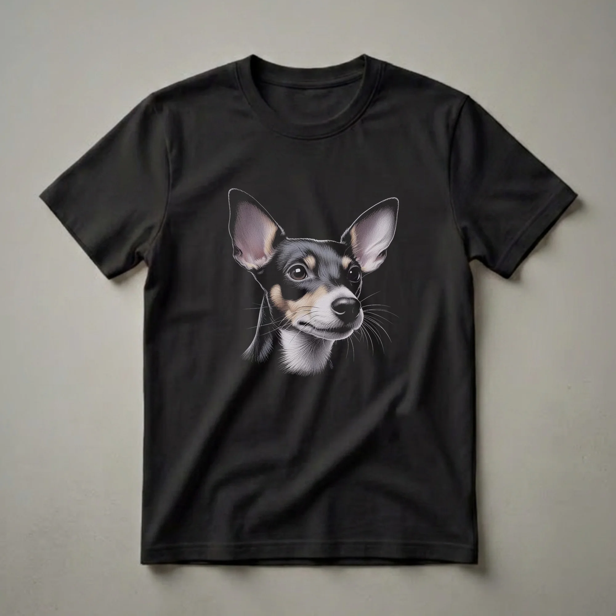 Rat Terrier enthusiasts who appreciate the breed's spirited personality and distinctive appearance will reach for this eye-catching graphic tee. This shirt features a meticulously rendered portrait of a Rat Terrier, capturing the breed's alert expression and characteristic large ears. The drawing style is detailed and realistic, with fine lines creating a textured look for the fur and a glossy sheen on the eyes and nose. Rat Terriers, originating in the United States, were historically bred for ratting and farm work, showcasing their intelligence and agility. This t-shirt is a thoughtful gift for any Rat Terrier owner, celebrating their beloved companion. It's a perfect way to express your affection for this energetic and loyal breed, whether you're out for a walk or relaxing at home. Wear this unique shirt to dog parks, pet-friendly cafes, or simply as a daily expression of your canine devotion. The detailed artwork makes this tee a standout piece for any dog lover's wardrobe, offering a sophisticated yet playful tribute to the Rat Terrier.