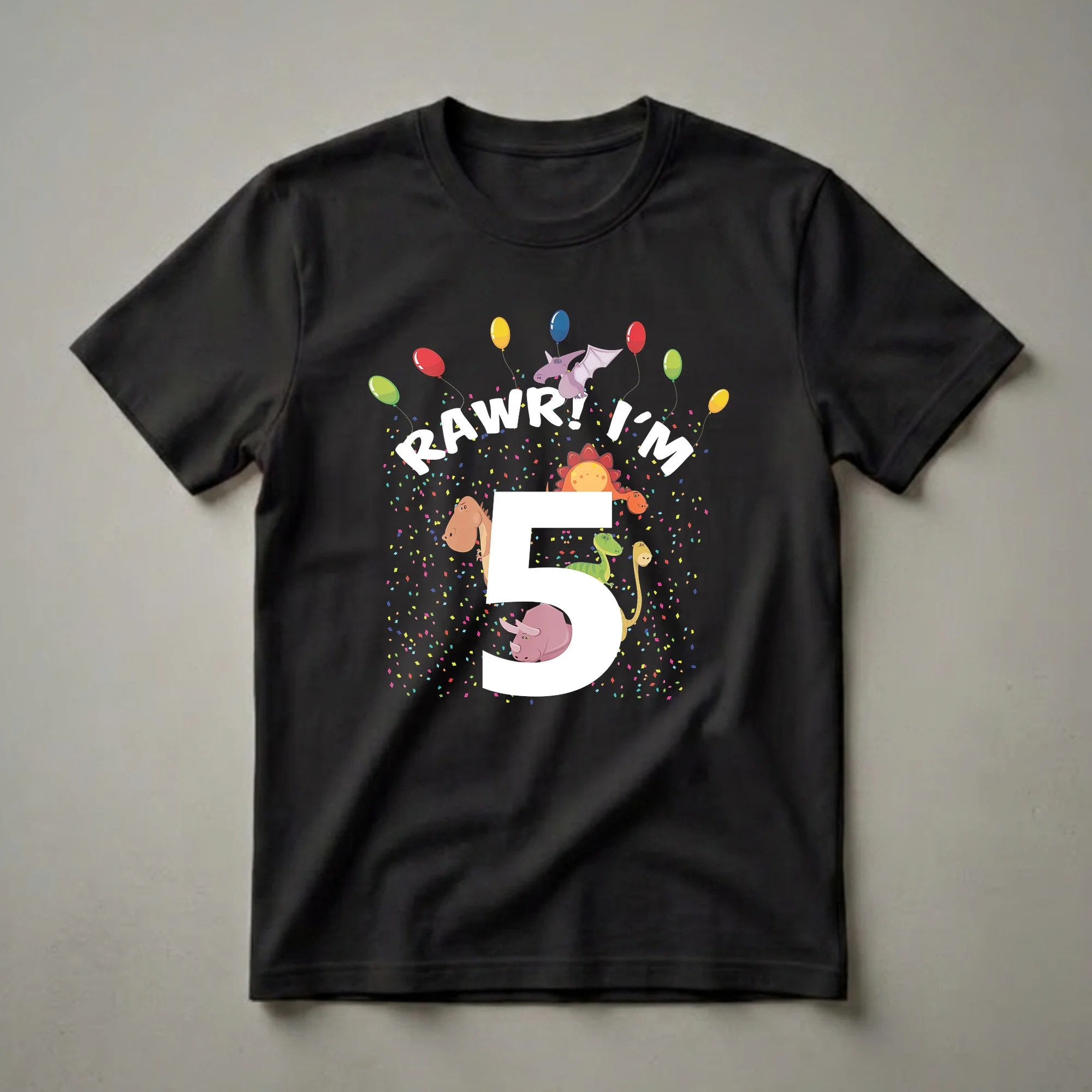 Five-year-olds are entering a new phase of childhood, often starting kindergarten or first grade, and this "Rawr! I'm 5" dinosaur t-shirt captures that exciting milestone. The graphic features a vibrant collection of cartoon dinosaurs, including a Tyrannosaurus Rex, a Triceratops, a Stegosaurus, a Pterodactyl, and a long-necked Brachiosaurus, all set against a backdrop of colorful confetti and balloons. The large, bold white number '5' is central to the design, emphasizing the age. This eye-catching tee is a fantastic way for any child turning five to express their love for prehistoric creatures and celebrate their special day. It's a thoughtful gift for any child who adores dinosaurs, making their birthday party or a casual day out roar-some. This shirt is suitable for both boys and girls who are ready to show off their big 5. Imagine their excitement wearing this to their birthday party, surrounded by friends and family, ready for cake and presents. This dinosaur shirt is a fun addition to any young child's wardrobe, a thoughtful choice for a child who is turning five.