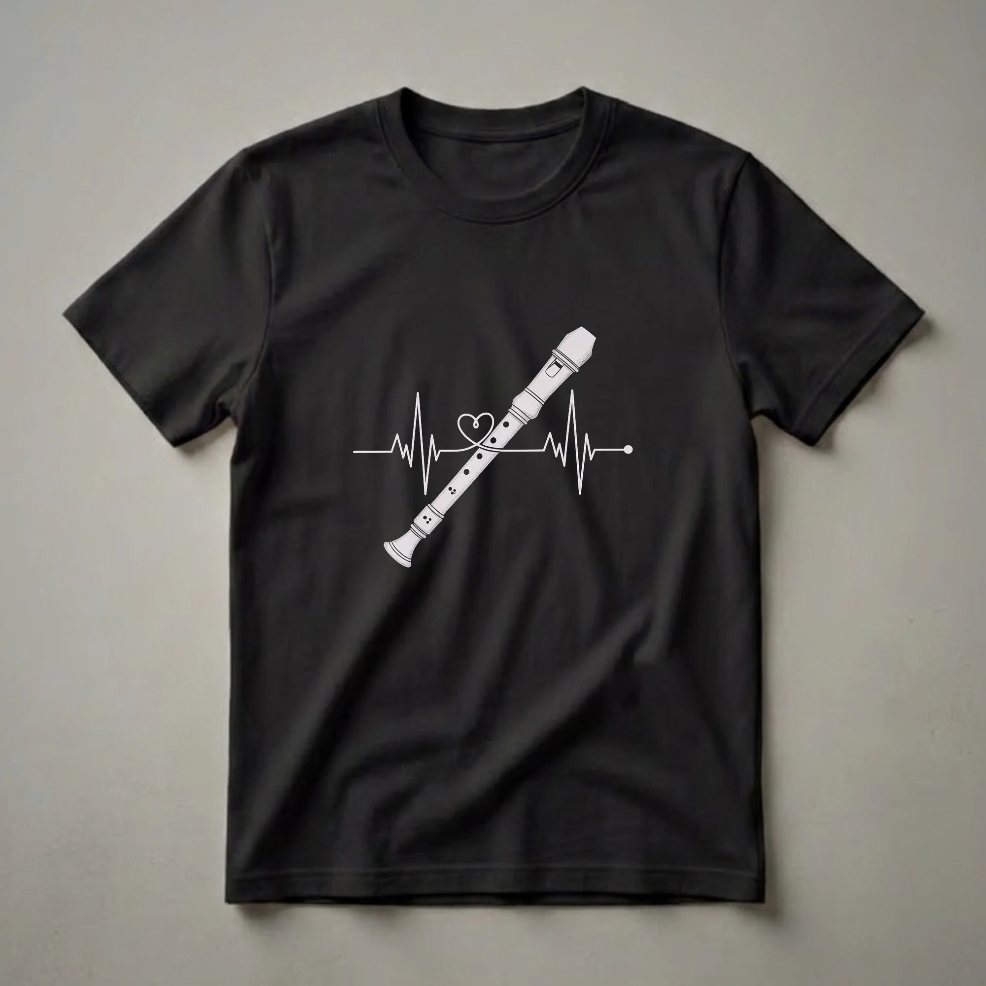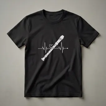 Recorder players who want to showcase their passion will reach for this eye-catching t-shirt. The design features a stylized white line drawing of a recorder, a woodwind instrument with a long history, elegantly integrated with a white EKG heartbeat line. A delicate heart shape is formed where the EKG line wraps around the recorder, symbolizing the deep connection between a musician and their craft. The recorder itself is depicted with its characteristic finger holes and a clear mouthpiece, rendered in a sketch-like art style that gives it a handcrafted feel. This graphic tee is a staple for any music student, band member, or music teacher who finds joy in the melodies produced by this versatile instrument. It makes a thoughtful gift for the recorder enthusiast in your life, suitable for wearing to band practice, music lessons, or casual outings. Celebrate your musical heartbeat with this unique piece of apparel that speaks to the soul of a true recorder player. The simple yet striking design is sure to spark conversations among fellow music lovers and performers.
