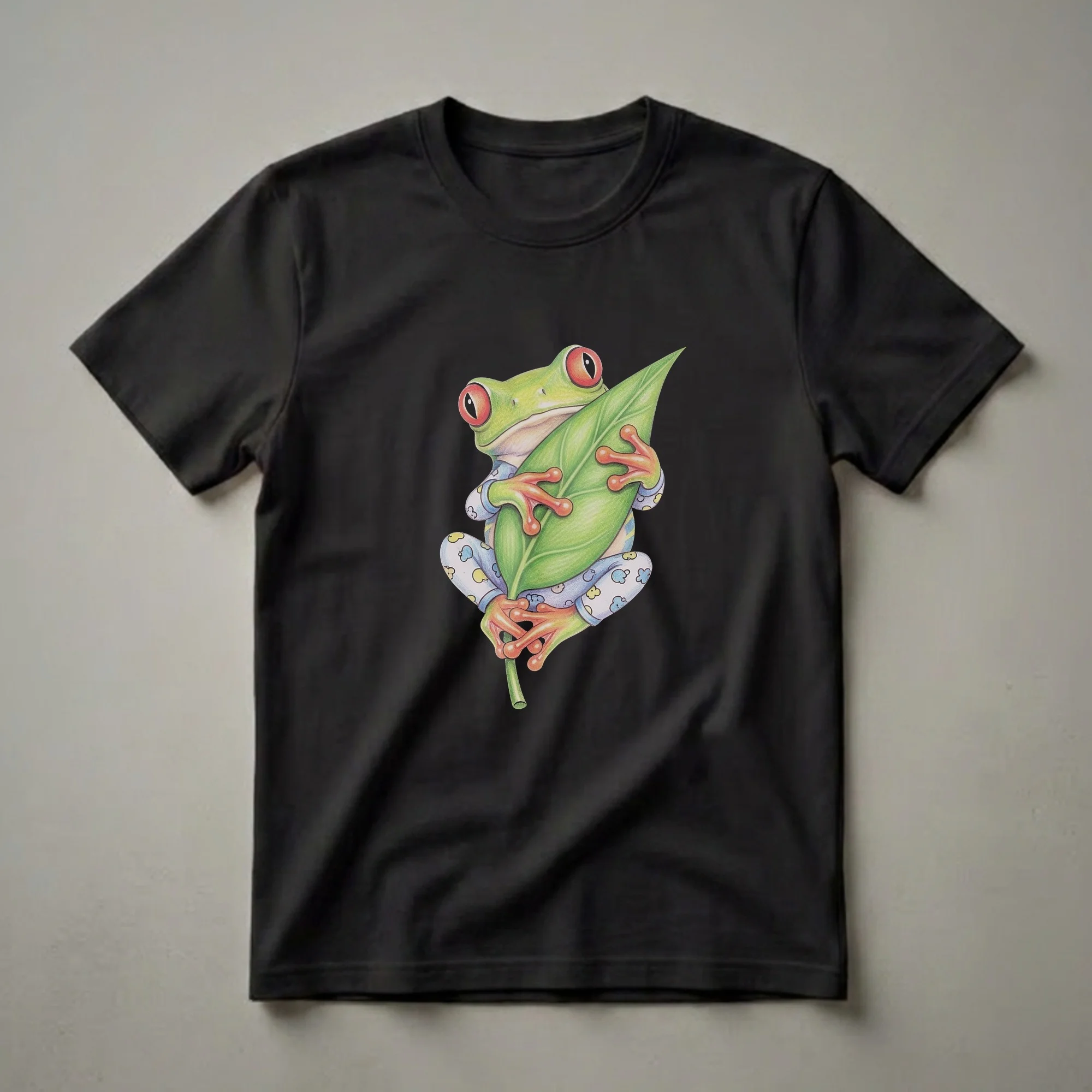 Red-eyed tree frogs, known for their vibrant green bodies and striking crimson eyes, are nocturnal amphibians native to the rainforests of Central America. This unique t-shirt captures the whimsical side of these fascinating creatures, depicting one dressed in adorable blue pajamas adorned with cloud and heart patterns. The frog is shown clinging to a large, detailed green leaf, its bright orange toes gripping the stem. This graphic tee is a playful tribute to the animal kingdom and the universal love for a cozy night's sleep. It's a thoughtful gift for any frog enthusiast, nature lover, or anyone who appreciates quirky, artistic designs. Imagine wearing this comfortable shirt to a casual game night or while relaxing at home. The detailed drawing style brings the sleepy amphibian to life, making it a conversation starter and a delightful addition to any wardrobe. This shirt is a go-to tee for those who find joy in the unexpected and appreciate the charm of a well-drawn, sleepy frog.