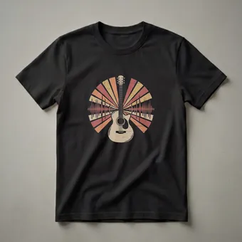 Musicians and guitar enthusiasts will reach for this striking graphic tee. The design features a detailed drawing of an acoustic guitar, a staple instrument in folk, blues, and rock music. Behind the guitar, a retro sunburst radiates outwards, complemented by a stylized soundwave graphic on either side, symbolizing the music produced. This tee is a thoughtful gift for any guitarist, whether they play acoustic or electric, and is great to wear to jam sessions, concerts, or casual outings. The vintage aesthetic makes it a unique addition to any music lover's wardrobe. The acoustic guitar, with its resonant hollow body, has been a cornerstone of popular music for decades, making this shirt a nod to musical history. This shirt works well for guitar students, band members, or anyone who appreciates the art of music.