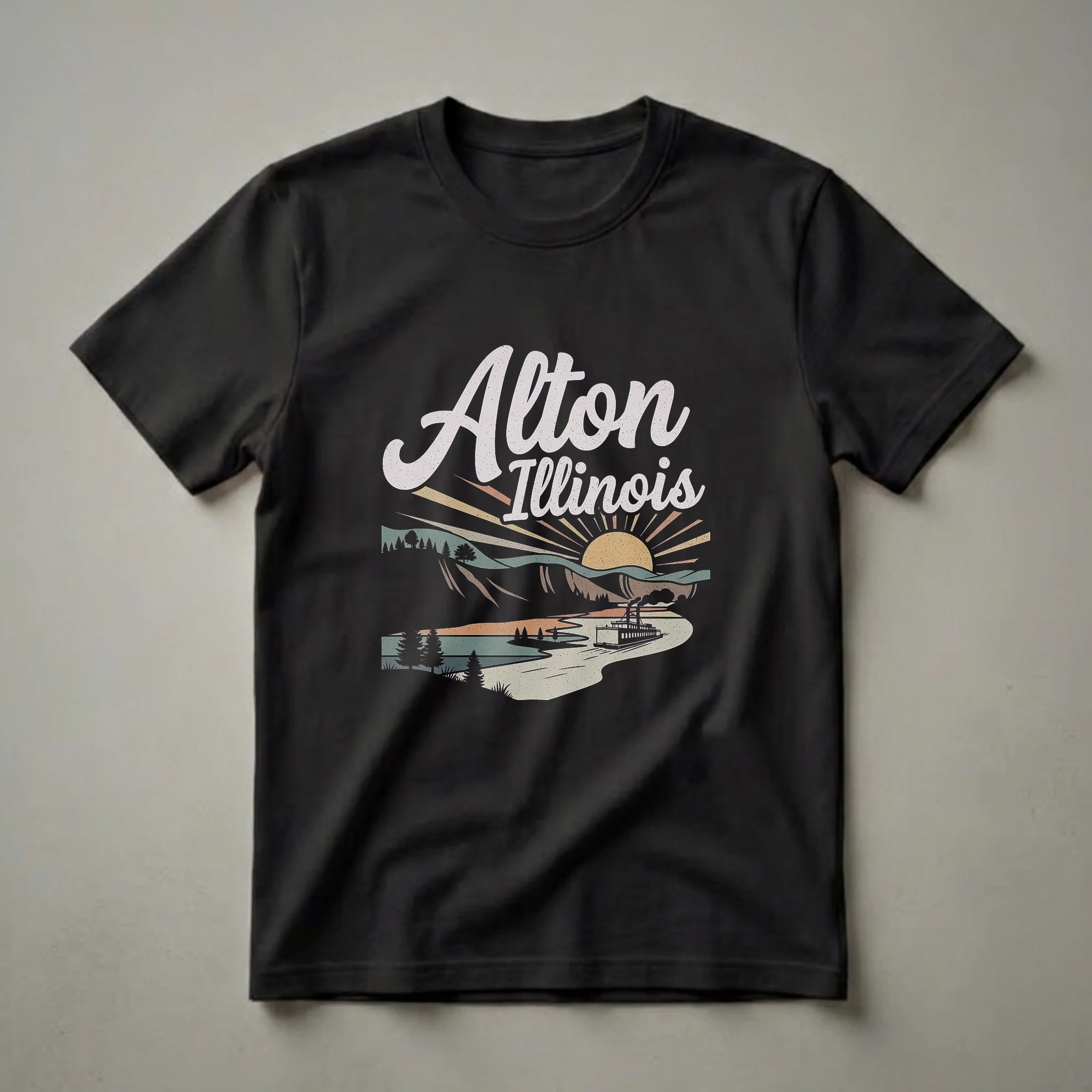 Alton, Illinois residents and visitors can now wear their pride with this retro-inspired graphic tee. The design captures a scenic view of the Mississippi River, a vital waterway for Alton's history and commerce, with a classic steamboat chugging along. The sun sets behind rolling hills, casting a warm glow over the landscape, rendered in a vintage color palette of muted oranges, yellows, blues, and greens. This shirt is a nod to the city's rich heritage and its connection to the river that shaped its development. Alton, located in Madison County, Illinois, has a long history tied to river trade and transportation, making this steamboat imagery particularly relevant. This t-shirt works well for anyone who appreciates the charm of the Midwest and the unique character of Alton. It makes a thoughtful gift for friends or family who have a connection to the city, whether they are lifelong residents or have fond memories of visiting. Wear this tee to local events, casual outings, or while exploring the historic sites of Alton, celebrating the spirit of this Illinois river town. This graphic shirt is a unique way to showcase your appreciation for Alton's scenic beauty and historical significance.