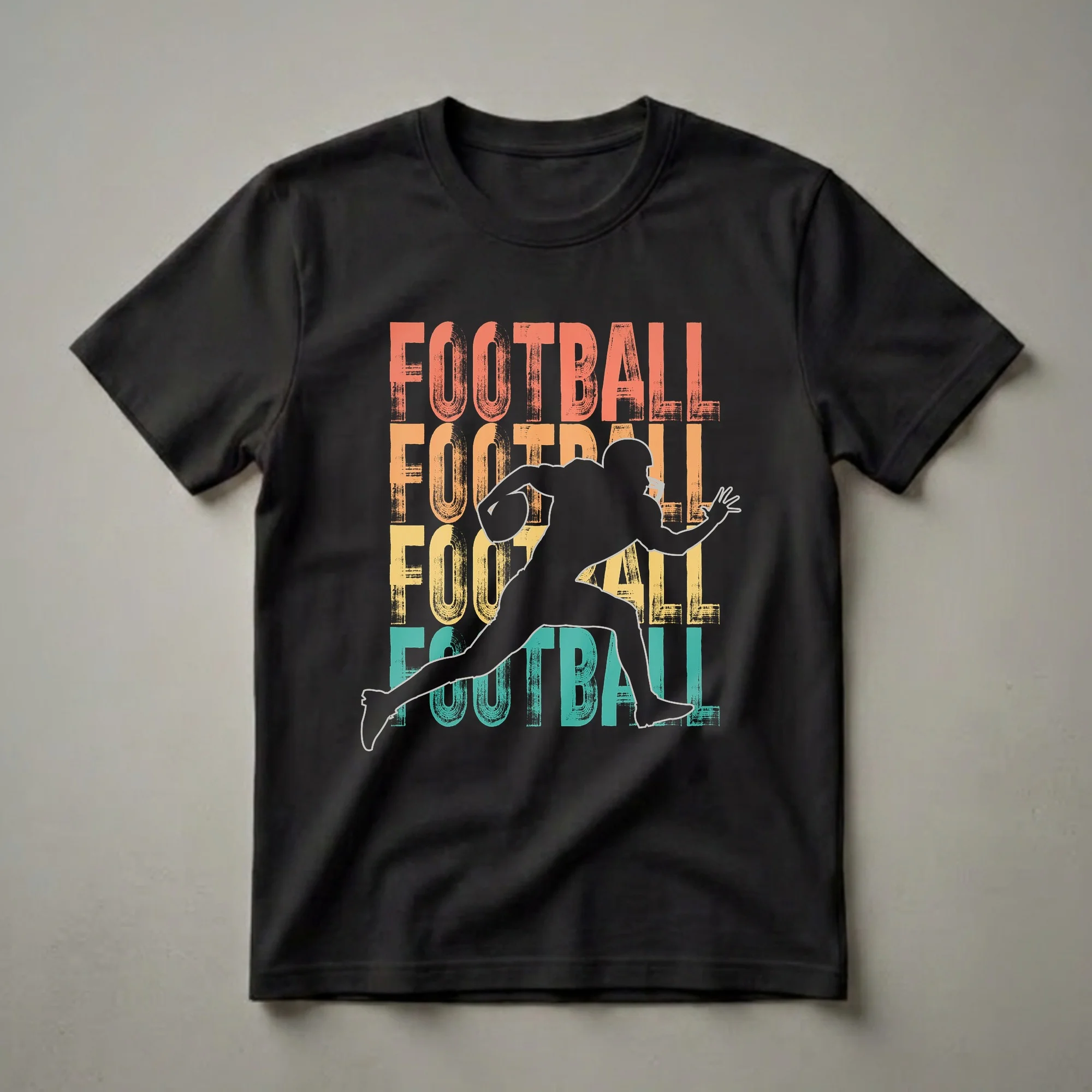 Football fans who appreciate vintage aesthetics will gravitate towards this striking graphic tee. The design features a bold, black silhouette of a football player in mid-action, poised to throw or catch the ball. Behind the player, the word 'FOOTBALL' is repeated multiple times in a distressed, retro font, rendered in a gradient of warm colors including orange, yellow, and teal. This visual style evokes a sense of nostalgia, reminiscent of classic sports apparel from past decades. American football is a sport deeply ingrained in American culture, known for its strategic plays, powerful athletes, and passionate fan bases. This shirt is a thoughtful gift for the football player in your life, whether they are a seasoned athlete or a dedicated fan who lives and breathes the game. It's a great choice for wearing to watch a game, to a casual get-together with fellow enthusiasts, or simply as a go-to tee for everyday wear. This apparel celebrates the spirit and excitement of American football, making it a staple for any supporter's wardrobe.