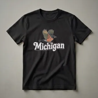 Michigan residents and fans of the Great Lakes region will appreciate this unique graphic tee. The design showcases a beautifully rendered American Robin, the state bird of Michigan, in mid-flight. Its wings are spread wide, displaying a palette of earthy greens, browns, and oranges, set against a distressed, vintage-inspired backdrop. Below the bird, the word "Michigan" is emblazoned in a bold, retro font with a cracked, weathered texture, evoking a sense of nostalgia and state pride. The American Robin is known for its cheerful song and is a common sight across Michigan's diverse landscapes, from its bustling cities to its vast forests and shorelines. This t-shirt is a thoughtful gift for anyone who loves Michigan, whether they are a lifelong resident, a proud Michigander, or simply someone who cherishes the natural beauty of the state. It's a comfortable and stylish way to wear your state identity, a thoughtful choice for casual outings, exploring the outdoors, or attending local events. This shirt is a go-to tee for expressing your connection to the Mitten State.