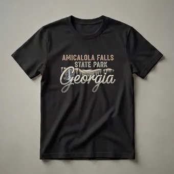 Amicalola Falls State Park, located in the North Georgia mountains, is a stunning natural landmark renowned for its breathtaking waterfall. This graphic tee captures the essence of the park with a retro-inspired design. The artwork features a depiction of the majestic Amicalola Falls cascading down rocky cliffs, surrounded by lush pine trees and rolling hills that evoke the scenic beauty of the Blue Ridge Mountains. The word 'Georgia' is prominently displayed in a stylish script font, anchoring the design to the Peach State. This shirt is a thoughtful gift for anyone who has experienced the wonder of Amicalola Falls, whether they are avid hikers, nature enthusiasts, or simply cherish memories of visiting this iconic Georgia destination. It's a great way for Georgians to express their state pride or for visitors to remember their trip. Wear this comfortable tee on your next outdoor adventure or casual outing to showcase your appreciation for Georgia's natural splendor. This t-shirt is a staple for any outdoor lover's wardrobe.