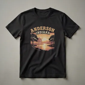 Anderson, Indiana residents and fans of the Hoosier State will appreciate this retro-inspired graphic tee. The design features a serene sunset scene over a winding river, framed by silhouetted trees and lush grass in the foreground. The warm, gradient colors evoke a sense of nostalgia, reminiscent of vintage travel posters and classic outdoor art. This t-shirt captures the essence of a peaceful evening in the Midwest, a landscape familiar to many in Indiana. Anderson, located in Madison County, is known for its rich industrial history and its connection to the White River, which flows through the area, inspiring this scenic depiction. This shirt is a thoughtful gift for anyone who has a connection to Anderson, whether they grew up there, have family there, or simply cherish the charm of Indiana. Wear this comfortable tee to casual outings, local festivals, or simply while relaxing at home, celebrating your Midwestern pride. It's a unique way to carry a piece of Anderson with you.
