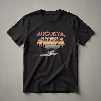 Augusta, Georgia residents and visitors can now showcase their pride with this striking retro-inspired graphic tee. The design features the city name, 'AUGUSTA, GEORGIA,' emblazoned across the top in a distressed, vintage font. Below, a vibrant sunset with horizontal stripes in hues of orange, yellow, cream, and teal sets the scene. A silhouette of pine trees lines the horizon, creating a classic landscape. A winding river, depicted in muted tones of beige and grey, flows through the foreground, with a lone bird soaring in the sky. This t-shirt is a thoughtful gift for anyone who calls Augusta home or has fond memories of the city. It's a staple in the collection for those who appreciate vintage travel designs and the natural beauty of the Peach State. Wear this shirt to casual outings, local events, or while exploring the charming streets of Augusta. The design evokes a sense of nostalgia and appreciation for the unique character of this historic Georgia city, known for its significant role in American history and its picturesque location along the Savannah River.