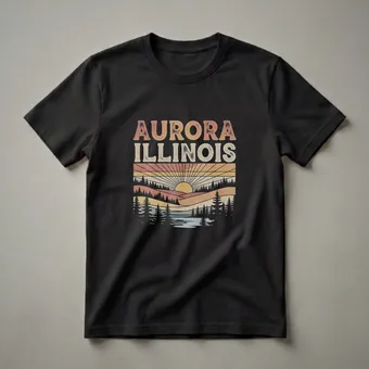 Aurora, Illinois residents and visitors who appreciate vintage aesthetics will reach for this striking graphic tee. The design features the text 'AURORA ILLINOIS' in a distressed, retro font, set against a vibrant, stylized sunset. Below the text, a serene landscape unfolds with rolling hills, silhouetted pine trees, and a tranquil body of water, evoking the natural beauty found near the Fox River, which flows through Aurora. This shirt captures the essence of Illinois's diverse geography, extending beyond the immediate Aurora area to encompass the broader Midwestern landscape. It's a thoughtful gift for anyone who cherishes memories of Aurora or enjoys a vintage outdoor vibe. Wear this t-shirt to casual outings, family gatherings, or while exploring the scenic parks around the city. This tee is a staple for those who want to represent their hometown with a touch of retro flair. It makes a thoughtful gift for friends and family who have a connection to Aurora, Illinois, whether they are current residents or former inhabitants looking to keep a piece of home with them.