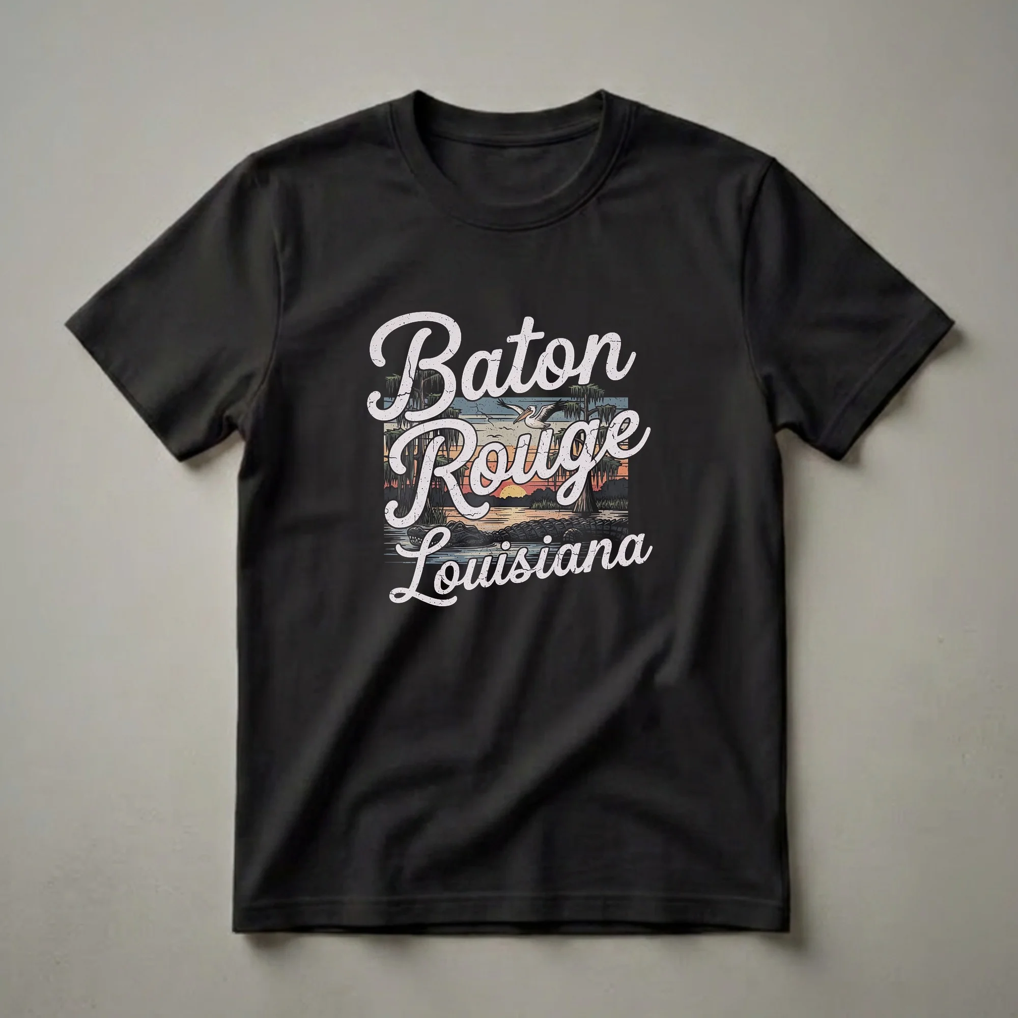 Baton Rouge residents and visitors who appreciate the unique charm of the Louisiana bayou will reach for this graphic tee. The design captures the essence of the region with a striking sunset over a swamp, complete with cypress trees draped in Spanish moss, a majestic pelican in flight, and a prominent alligator in the water. Baton Rouge, the capital of Louisiana, is known for its rich history, vibrant culture, and stunning natural landscapes, including the expansive Atchafalaya Basin, one of North America's largest wetlands. This tee serves as a wearable reminder of the city's distinctive environment. It makes a thoughtful gift for anyone who has a connection to Baton Rouge, whether they are a lifelong resident, a former student, or a traveler who fell in love with the area. Wear this shirt to casual outings, to explore local attractions, or simply to showcase your Louisiana pride. This t-shirt is a staple for anyone wanting to represent the unique spirit of Baton Rouge.