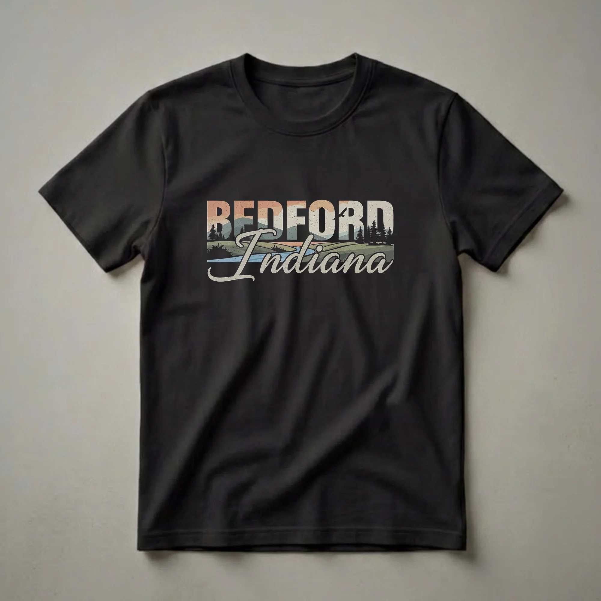 Bedford, Indiana residents and fans of the Hoosier state will appreciate this retro-inspired graphic t-shirt. The design features the words "BEDFORD Indiana" in a bold, distressed font, set against a stylized landscape. Rolling hills in muted tones of orange, green, and blue create a vintage sunset scene, complete with silhouetted pine trees and a winding river. A bird in flight adds a touch of natural movement to the artwork. This comfortable tee is a great way for anyone who calls Bedford home to showcase their local pride. It makes a thoughtful gift for friends or family who have ties to this charming Indiana city. Wear this shirt to local events, casual outings, or while exploring the natural beauty of the Midwest. It's a staple in any collection celebrating Indiana heritage.