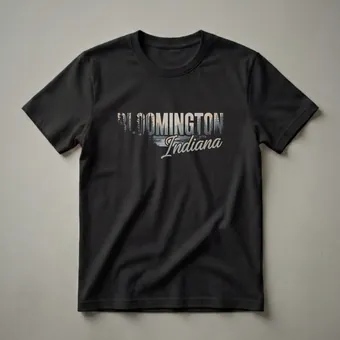 - Features 'BLOOMINGTON' in distressed block letters with 'Indiana' in flowing script.