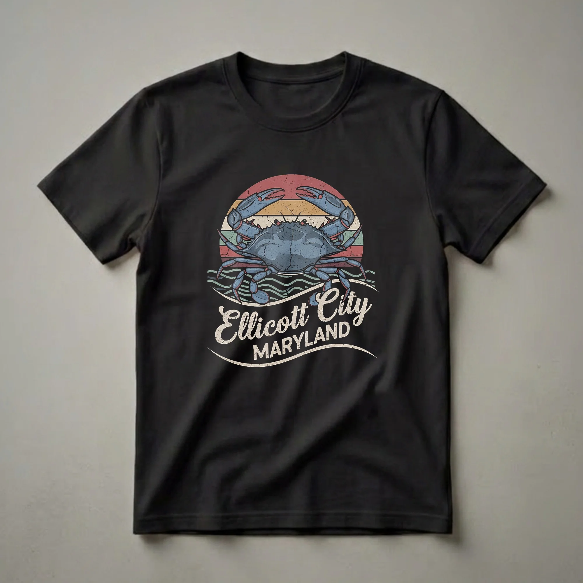 - Retro Ellicott City Maryland graphic t-shirt featuring a blue crab.