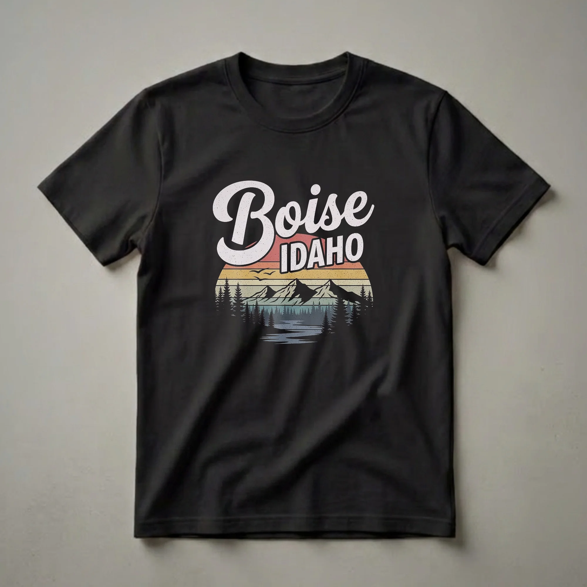 Boise, Idaho, a city nestled in the Treasure Valley, offers a unique blend of urban amenities and outdoor adventure, perfectly captured in this retro graphic tee. The design showcases the iconic Boise skyline against a vintage sunset, complete with majestic mountains, dense pine forests, and a serene body of water. This visual evokes the spirit of the Rocky Mountains that surround the capital city, known for its vibrant arts scene and proximity to outdoor recreation. The state of Idaho itself is renowned for its stunning natural landscapes, from the Sawtooth Mountains to the Snake River. This t-shirt is a staple for anyone who calls Boise home, has fond memories of visiting, or simply appreciates the rugged beauty of the Pacific Northwest. It makes a thoughtful gift for the traveler who has explored the area or the local who cherishes their hometown pride. Wear this shirt to casual outings, hiking trips, or while reminiscing about your adventures in Idaho's capital.